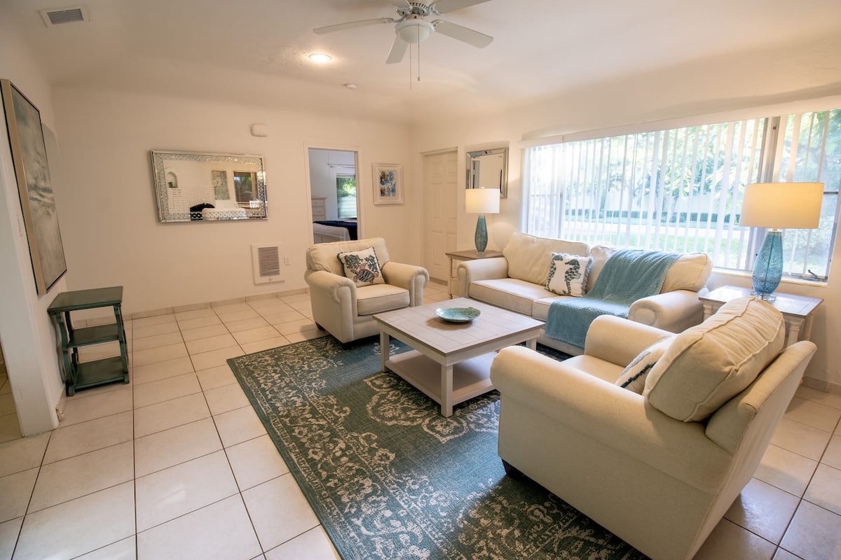 ¡A 3 casas (200 yardas, 0,1 millas) del acceso a la playa! ¡Somos uno de los alquileres de casas más cercanos a la playa! Perfecta para 2 parejas: planta dividida con 2 camas tamaño queen (somieres eléctricos) con 2 baños completos + amplio sofá de 7 plazas. Cada habitación tiene un televisor de 55-65 pulgadas con Comcast, wifi rápido, HBOMax, Netflix, Hulu, AppleTV. ¡Nuestra casa está cerca de todo! - Playa: 3 casas (en la carretera de acceso a la playa). - Centro de la ciudad: a 0,3 millas de restaurantes/bares. - Publix/CVS: a 9 casas de distancia.