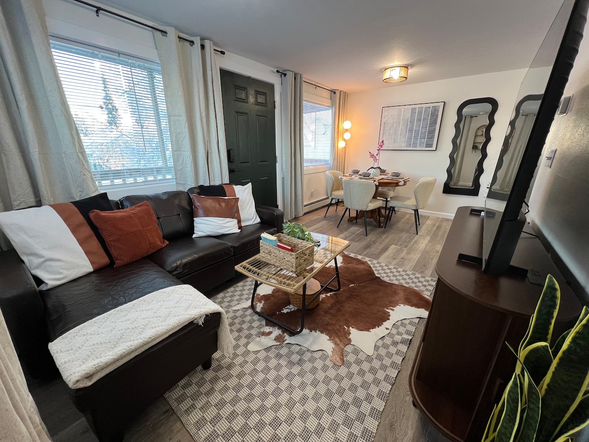 Una moderna casa adosada para una estancia agradable y cómoda. El dormitorio incluye una cama tamaño king y baño principal con ducha a ras de suelo con efecto lluvia. La sala de estar cuenta con un acogedor sofá grande para ver la televisión o disfrutar de tu café. También se incluye una cocina completa con todo lo que uno pueda necesitar. Disfruta de tu estancia en un refugio contemporáneo. Ubicado en la ciudad. Me enorgullezco de asegurarme de que la unidad esté extremadamente limpia y tenga todo lo que necesitas.
