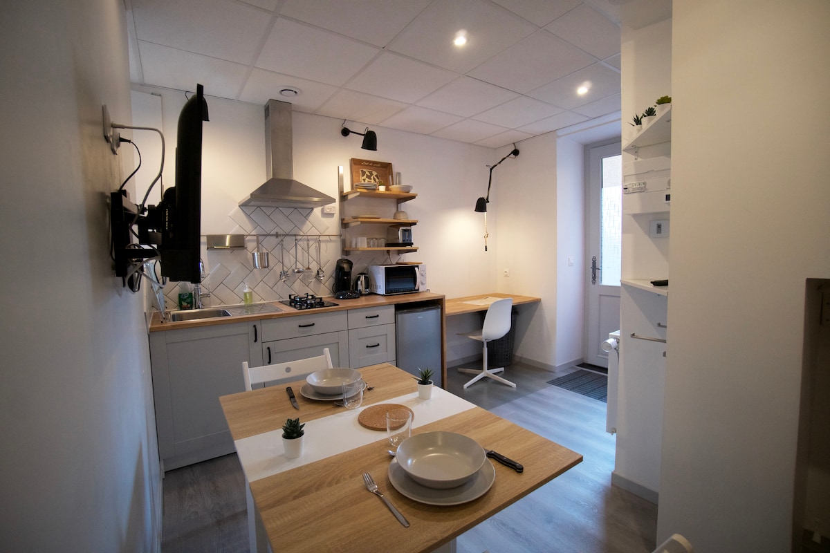 MIREPOISES – ESCAPADA INUSITADA Acogedor estudio de 19 m², totalmente equipado, situado en la planta baja en una calle tranquila del centro de Figeac. A 4 minutos a pie del museo y de la plaza Champollion. Estacionamiento gratuito y paradas de autobús (gratis) a 2 minutos. Decoración: - Habitación principal con armario-cama, escritorio, zona de TV y cocina equipada. - Cuarto de baño con inodoro. - Wi-Fi gratuito. - Lavandería disponible en las áreas comunes