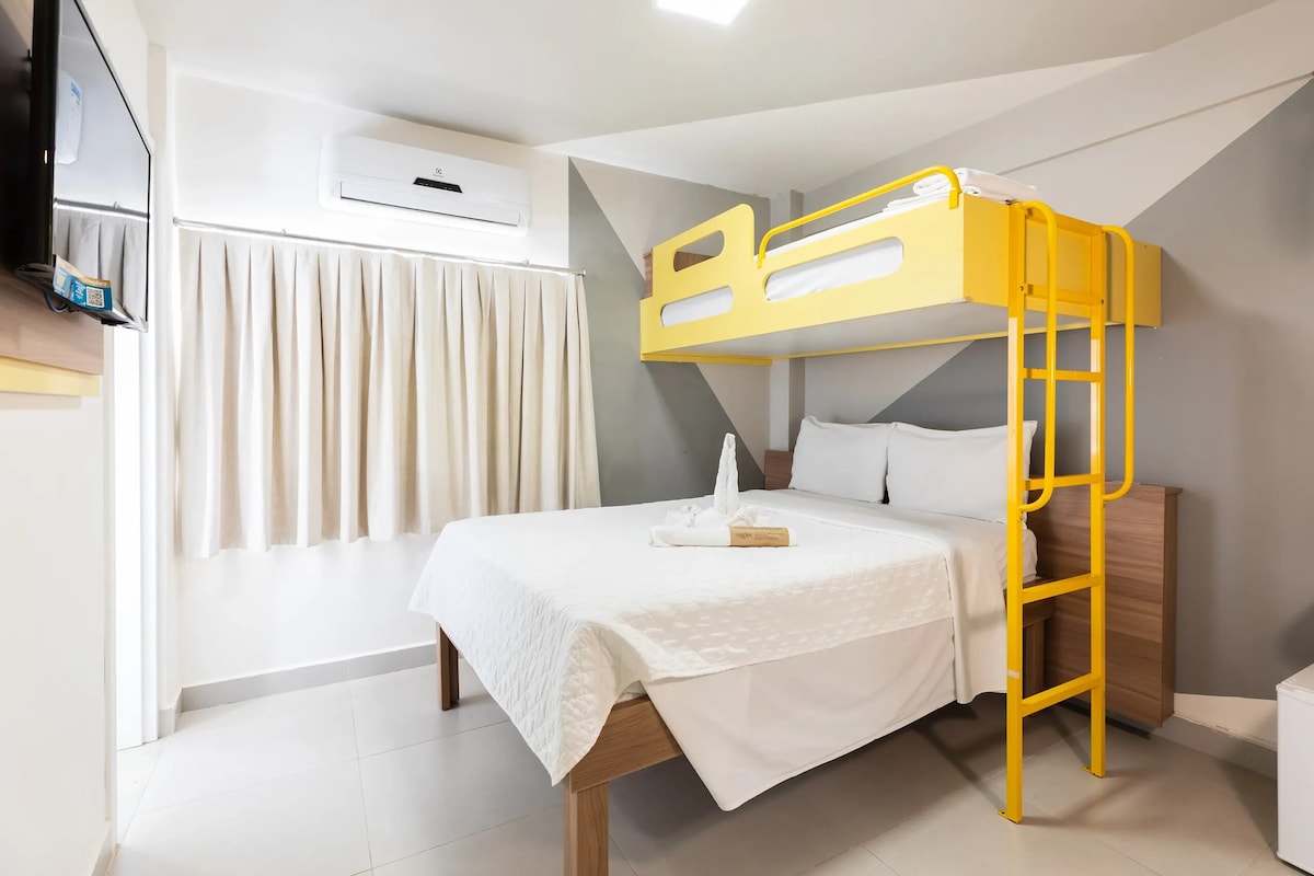 Acolhedor e completo, o quarto para até dois adultos oferece cama de casal e solteiro sobreposto, além de frigobar, Wi-Fi, TV e banheiro privativo — tudo para uma estadia leve e descomplicada.