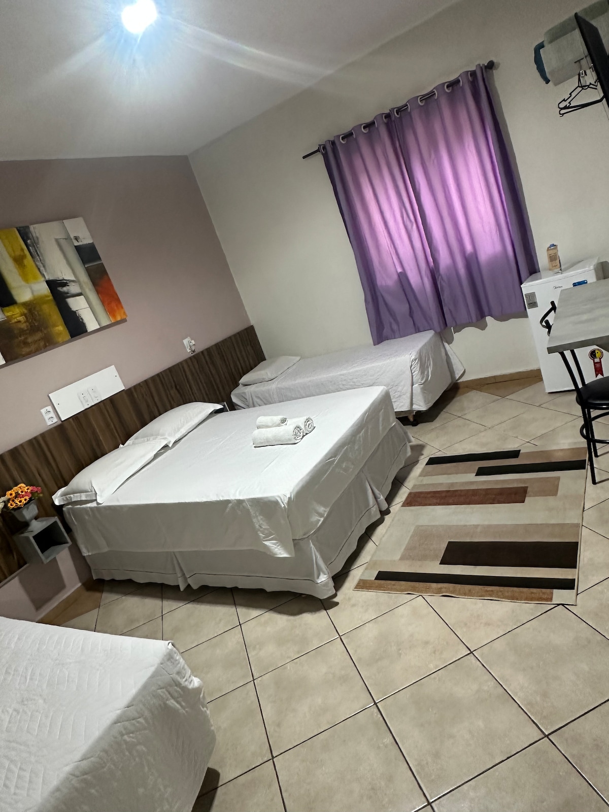 La suite contiene una cama doble + 2 camas individuales. Tiene wifi, aire acondicionado, TV inteligente y caja fuerte. El baño privado incluye toallas, champú, acondicionador, jabón y secador de pelo. El complejo se encuentra en la Avenida das Cataratas y ofrece instalaciones para tu comodidad. En el edificio, encontrarás una lavandería de autoservicio, cambio de divisas, agencia de viajes, alquiler de autos, metro y tienda de comestibles abierta las 24 horas con un cajero automático para operaciones bancarias en cualquier momento.