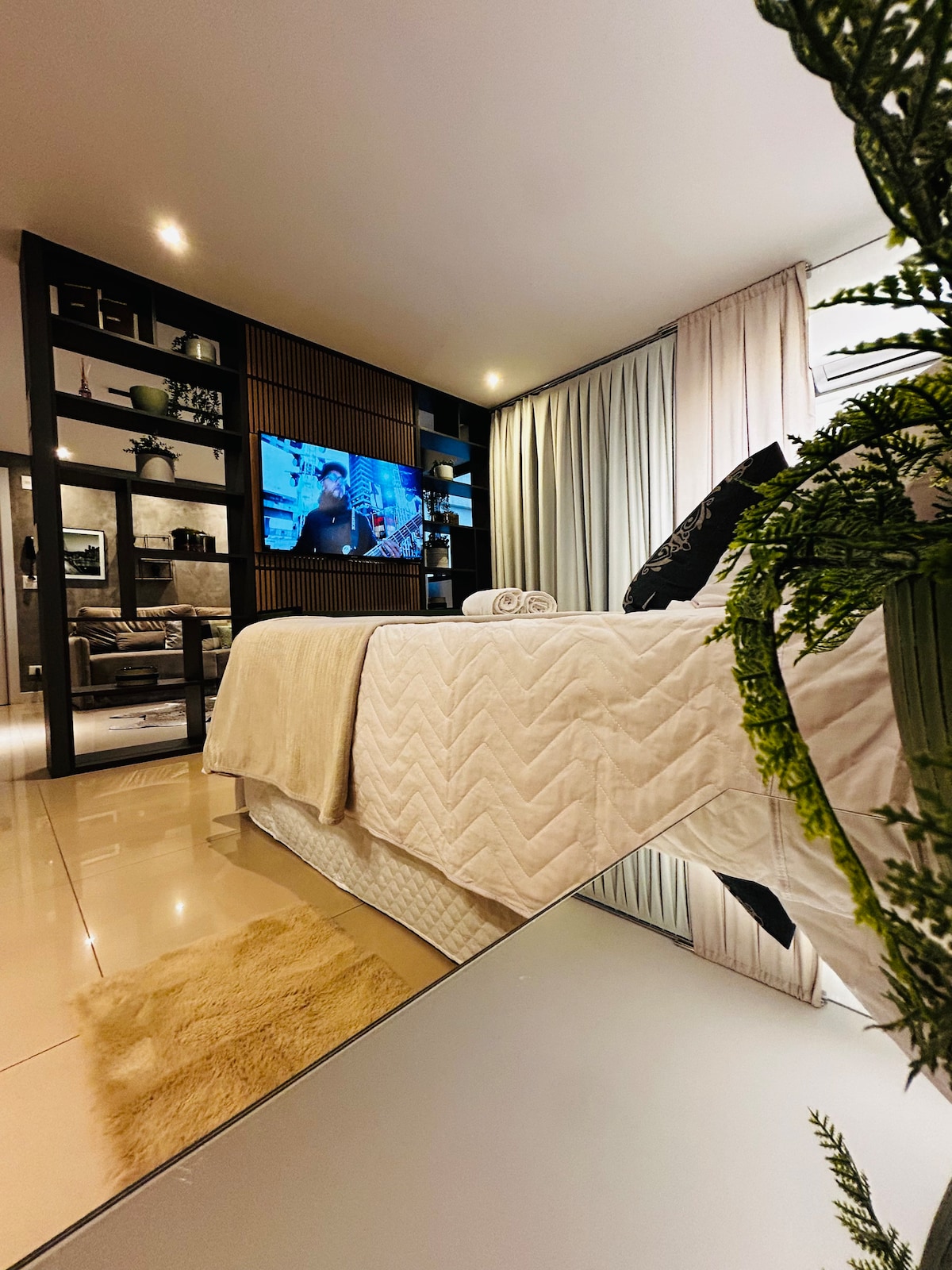 Para alquileres a largo plazo (con contrato), podemos incluir una piscina termal cubierta, gimnasio y sauna. - 82 m² de espacio habitable; - Televisor inteligente de 55 pulgadas, Disney+, Amazon Prime, HBO Max, Wi-Fi de 350 mb; - GARAJE 2 espacios de estacionamiento numerados y cubiertos; - Acceso por ascensores; - Cama tamaño king + 4 almohadas. - Cocina equipada. - Lavadora y secadora; - Sofá retráctil, espacioso y cómodo; Debido a que es un loft sin barrera de sonido entre las habitaciones, es ideal para 2 personas y puede alojar hasta 3 personas (colchón).