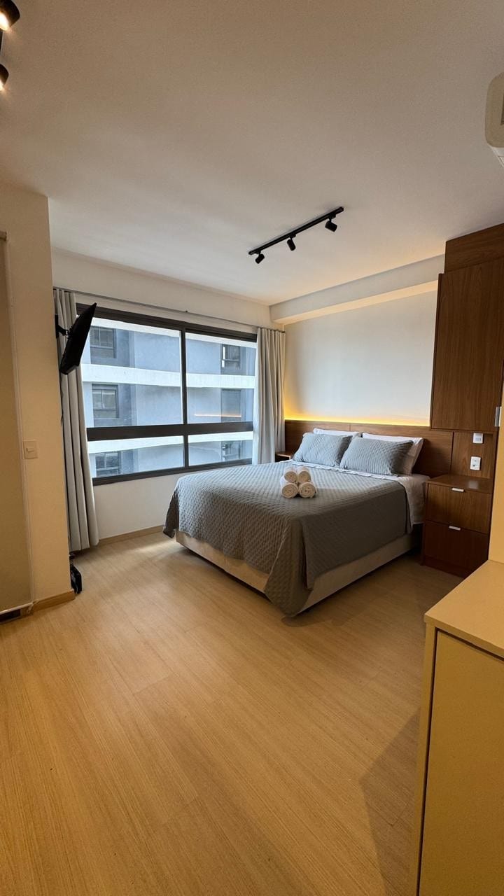 Disfruta de una experiencia elegante en este lugar bien ubicado. Estudio encantador, bien decorado y acogedor con un espacio de estacionamiento en un edificio con una piscina en la azotea. Sala de fiestas, lavandería, ludoteca, gimnasio y tienda Pão de Açúcar Minuto (minimercado) en la planta baja. Con la opción de cerrar/abrir el vidrio del balcón en un aire de casa con la seguridad de un condominio. Muchos gabinetes y artículos para el hogar le dan al huésped la sensación de estar en casa. Wifi de fibra VIVO de 600 Mbps.
