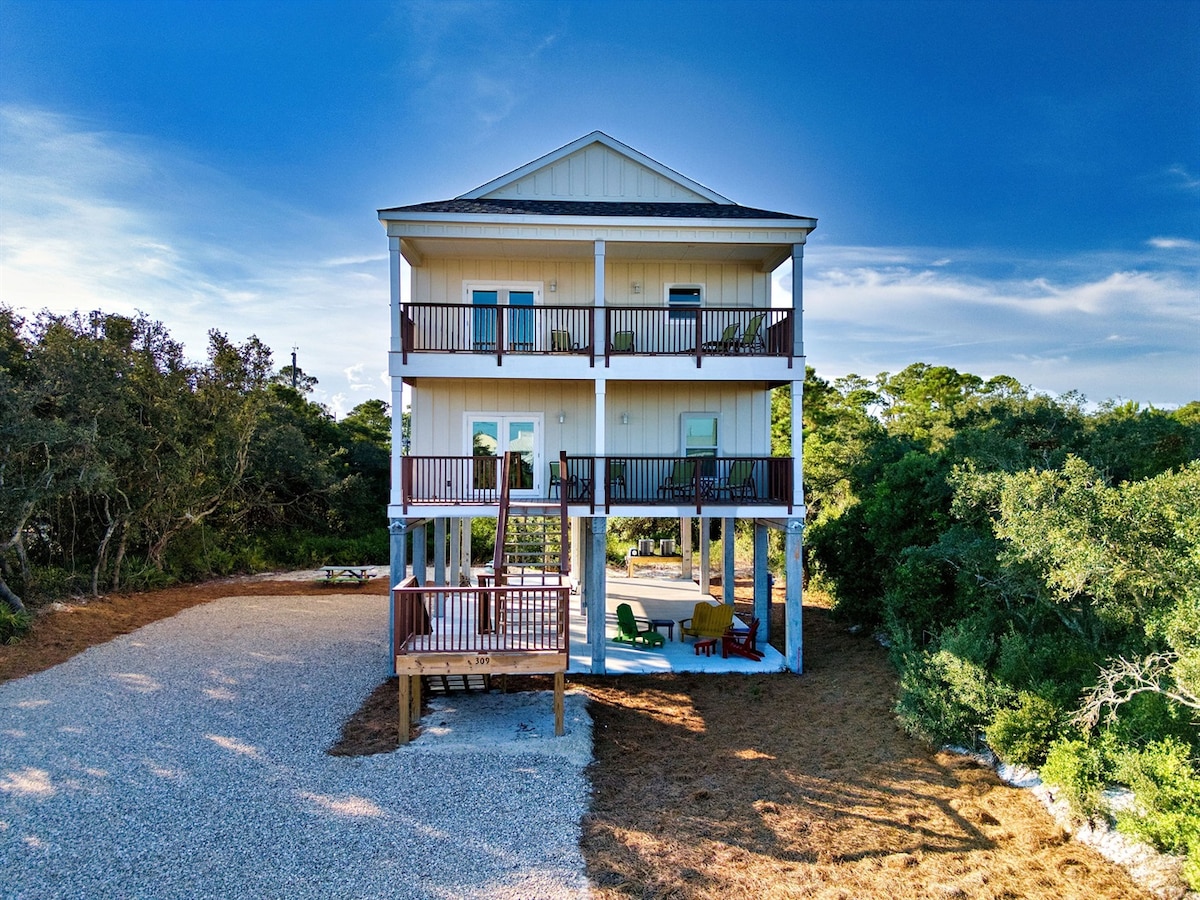 Giggle está situado en uno de los lugares más deseados del mango de la sartén de Florida, ofreciendo una gran cantidad de actividades, varios restaurantes y bares locales, una tienda de surf y un parque estatal. ¡Imagina tener todo esto justo en tu puerta! ¡Ah! ¿Y mencionamos que estamos justo en el borde del golfo de México? No hay nada más relajante que despertarse, con una taza de café en la mano, y ver a los delfines jugar en las olas de la madrugada desde tu porche delantero.