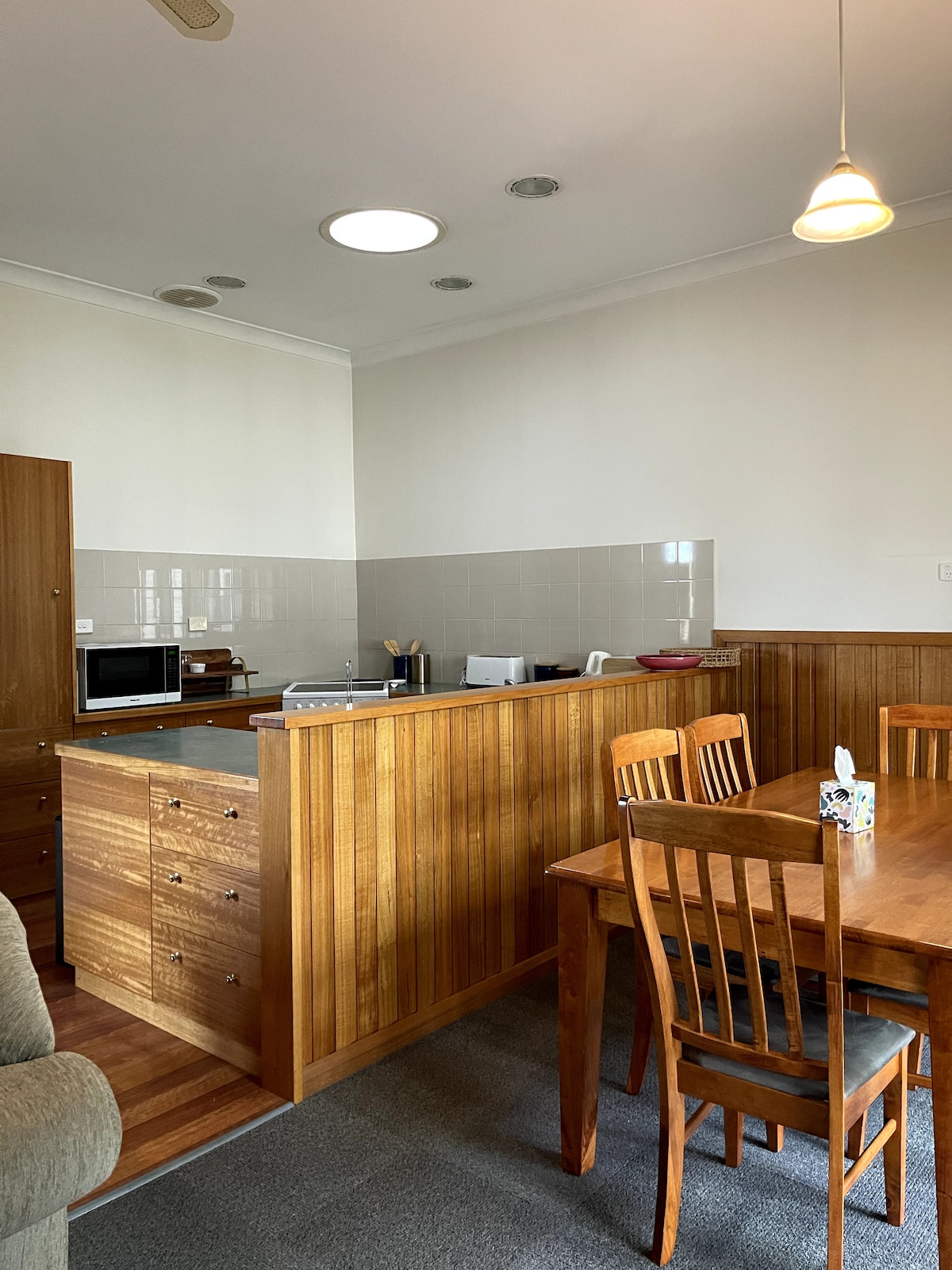 Un hermoso lugar para relajarse y disfrutar de las vistas del río Huon. A poca distancia a pie de cafés y hoteles locales. Paseo por la explanada con parque infantil y señalización histórica. Baño de lujo con ducha separada, bañera doble profunda. Lavandería. Cama tamaño king en el dormitorio principal (no se divide) cama individual adicional como salón de día en la sala de estar. 2 televisores, wifi. Buena cocina con horno y estufa. Artículos básicos de despensa. Porche en la parte trasera con barbacoa. Terraza delantera para buenas vistas. Estacionamiento gratuito en el lugar.