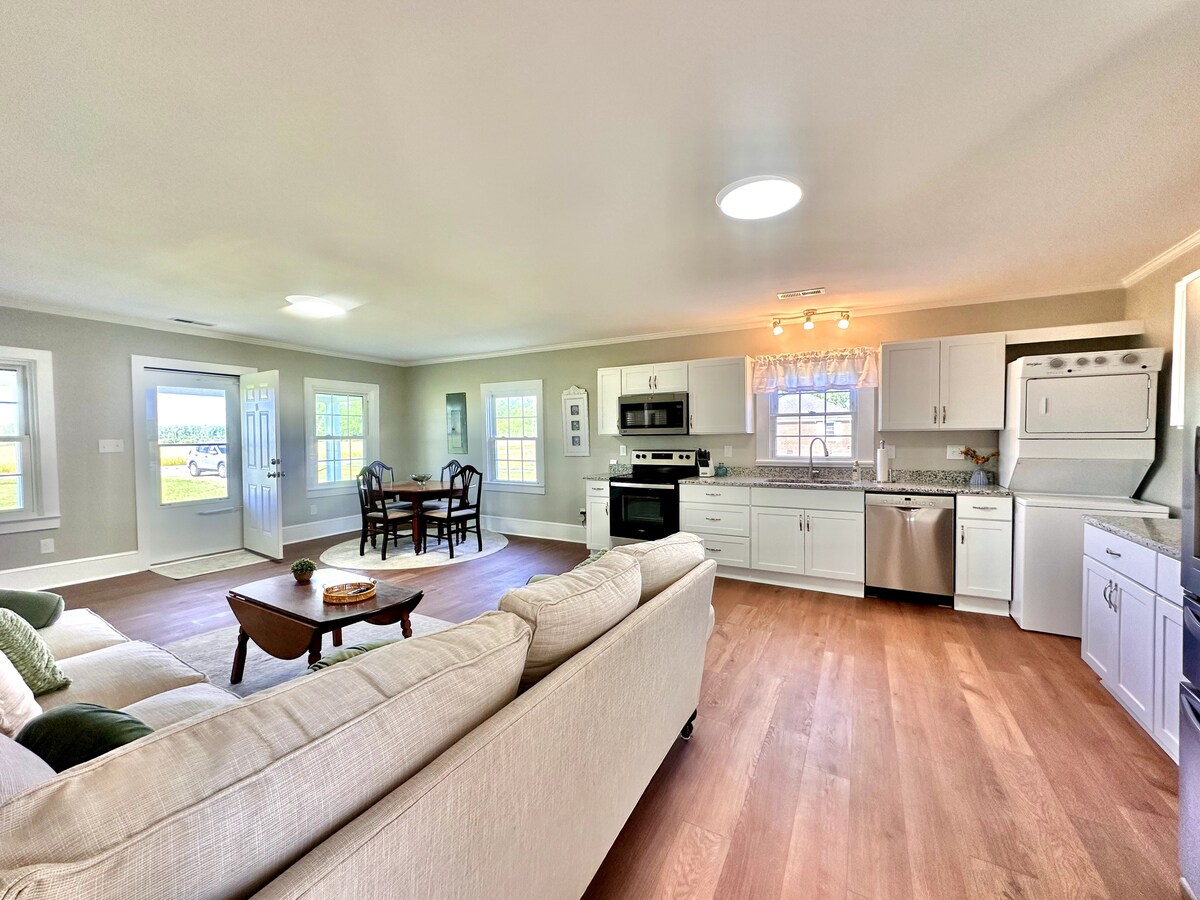 Nuestra casa de campo es un lugar de escapada tranquilo. Siéntate en el porche delantero y disfruta de los pájaros y de una taza de café. La pequeña cocina ofrece todo lo que puedas necesitar para tu estancia, incluido un delicioso manjar local. Un escritorio en el dormitorio te ofrece un lugar para trabajar mientras otros miembros de tu grupo utilizan los espacios de la sala de estar o el comedor. Puedes pasear tranquilamente por el parque Ruritan hasta la galería Studio 32 y la tienda de regalos los fines de semana. A 10 minutos en coche del parque estatal Merchants Millpond. La histórica Edenton a solo 30 minutos.