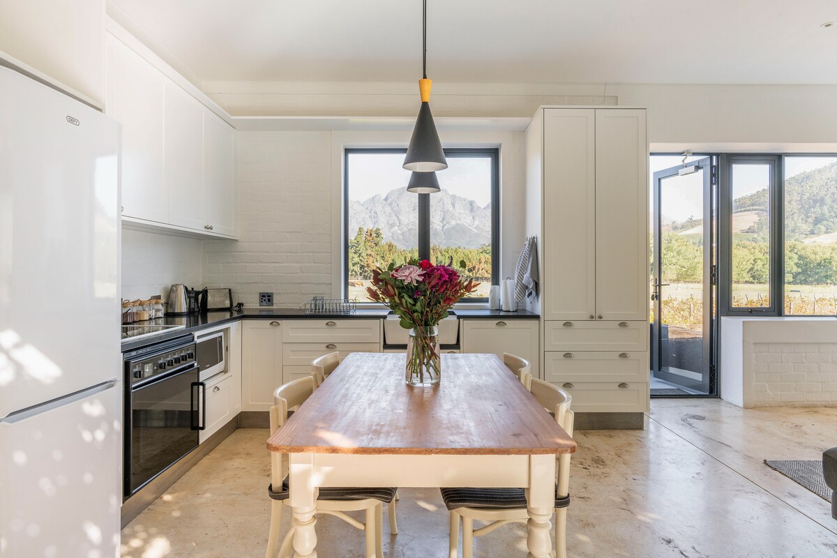 Saluda al día con un desayuno frente a las maravillosas montañas y vistas al campo desde el soleado balcón. Desde sus techos abovedados con vigas de madera y su decoración rústica elegante hasta su chimenea con fachada de ladrillo, este plácido escondite brilla con un encanto idílico. Ubicado en 2 hectáreas de hermosos jardines, con árboles frutales, viñedos y rodeado de montañas. ¡Disfruta de una copa de vino frío y de las hermosas puestas de sol desde el gran balcón con una de las mejores vistas! Refréscate en la piscina de inmersión y relájate en la zona de la piscina sombreada por árboles o, en esos días húmedos de invierno, acurrúcate junto a la chimenea interior. La propiedad está cerrada, los huéspedes tienen su propio acceso y pueden recorrer la propiedad. Nos gusta dar a los huéspedes su propio espacio, sin embargo, tanto yo como un miembro del personal estamos siempre disponibles y encantados de ayudarte. Ubicada entre imponentes paisajes montañosos y viñedos perdurables, esta propiedad se encuentra en Franschhoek, una ciudad conocida por sus restaurantes de clase mundial, catas de vinos y belleza natural. Visita el Museo Conmemorativo Hugonote para conocer la historia local. Uber está disponible recientemente en Franschhoek, pero tiene una presencia limitada (después de las 23:00/24:00). También hay un taxi tuk tuk disponible, consulta la información adjunta para ponerte en contacto. Ten en cuenta que hay un amable perro joven rescatado que deambula libremente por la propiedad. Ubicada entre imponentes paisajes montañosos y viñedos perdurables, esta propiedad se encuentra en Franschhoek, una ciudad conocida por su gastronomía de clase mundial, cata de vinos y belleza natural.
