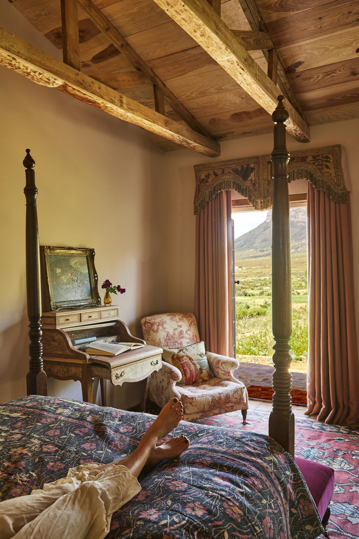 Femenina, en capas y llena de arte, como lo era Ouma Celia, nuestra Viviene Leigh del río Vaal. Un homenaje en rosa y pistacho. Las dos cabañas están situadas justo debajo de Die Boekklub y tienen vistas a las montañas Drakenstein. Las cabañas comparten una envoltura alrededor de la terraza y un pequeño jardín privado.