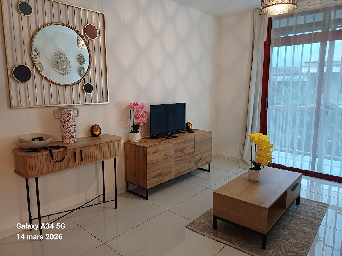 ¡Hola! ¡Bienvenido! Le ofrecemos una estadía en un estudio T2 renovado, cálido y cómodo, en una zona tranquila de Kourou. Agradable salón con TV y Wi-Fi, cocina equipada. Acogedora habitación separada con cama king size y ropa de cama de calidad. Pequeña terraza ideal para un café por la mañana o para fumadores. Playa accesible a pie en 5 minutos, tiendas cercanas. Apartamento totalmente renovado y cómodo ubicado en una zona tranquila de Kourou, lugar acogedor con todos los equipos cerca de la playa 5