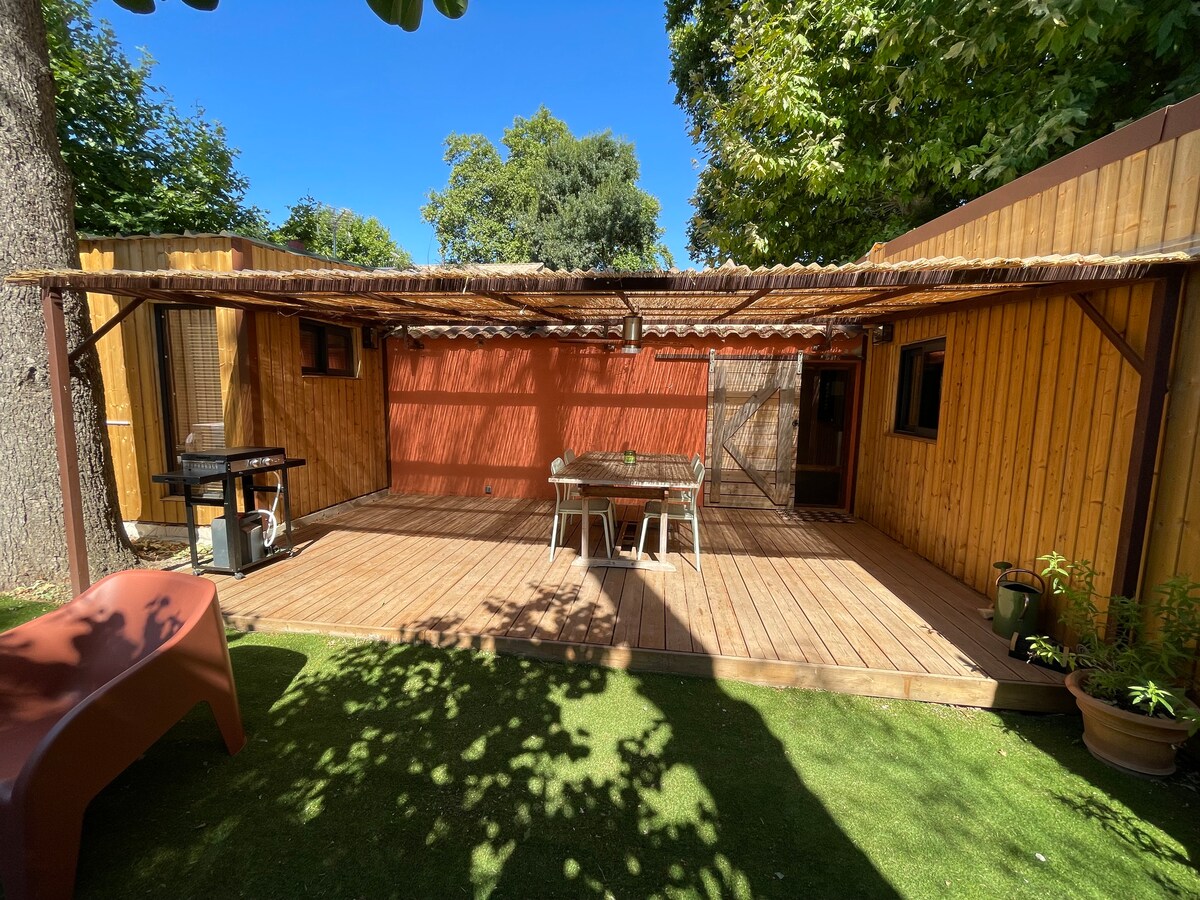 Acomódese cómodamente en este alojamiento rural y venga a compartir nuestro jardín. Cocina equipada, zona de dormitorio, cuarto de baño, terraza privada con barbacoa Acceso a la piscina (8x4) con condiciones de horario, tumbona para relajarse Posibilidad de sesión de Spa/ Jacuzzi de 45 min de pago adicional. Terreno de petanca En la capital del higo a 20 minutos del mar