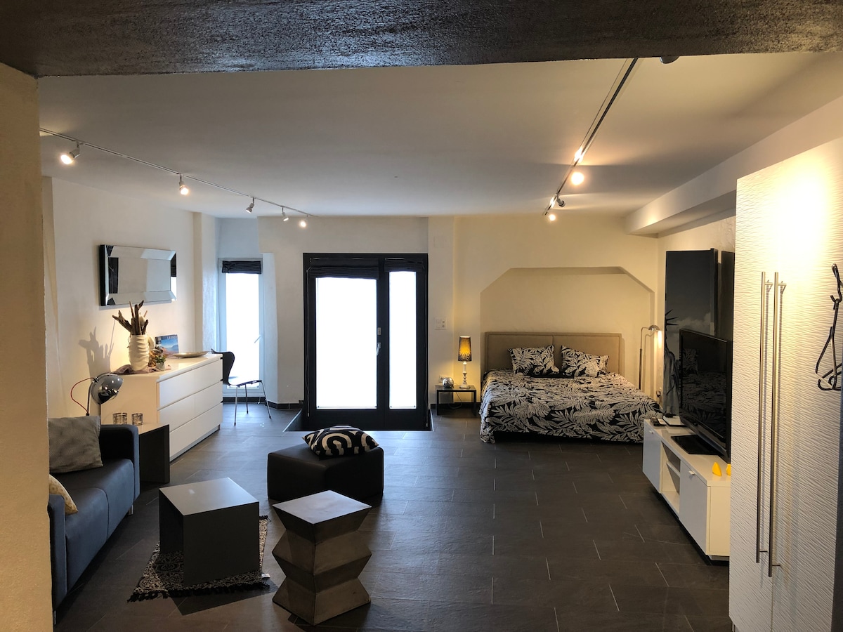 Tus anfitriones Sandra y Noël te dan una cálida bienvenida al loft recientemente renovado en Im Fang. La acogedora habitación se encuentra en un antiguo cuartel militar, tiene 52 m2 y cuenta con una cama doble, así como un cómodo sofá que se puede utilizar para huéspedes adicionales si es necesario. ¿No estás para cocinar? No hay problema, ¡nos encanta! ¡Y estaremos encantados de mimarte con delicias locales o un buen menú gourmet! Nuestro lema: Tu hogar lejos de casa