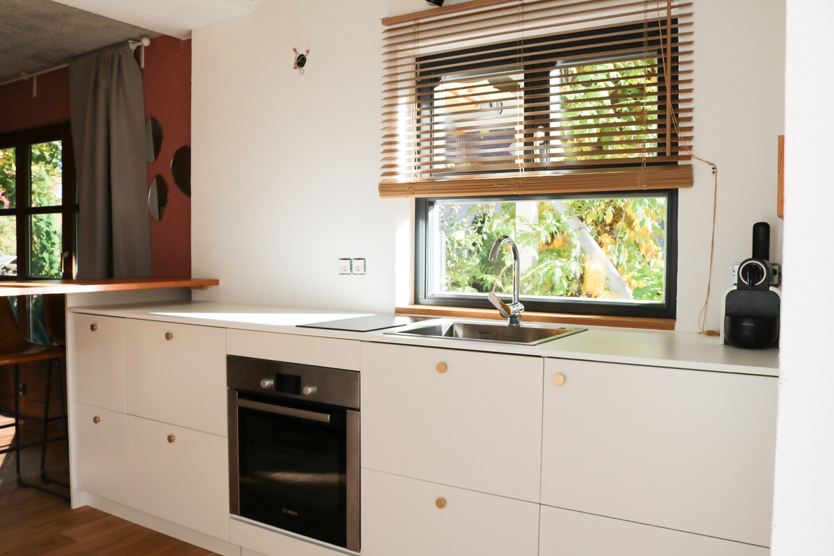 Pasarás tu estancia en un apartamento colorido y acogedor, que tiene entrada privada. En la terraza cubierta de 20 metros cuadrados con salón frente al apartamento, puedes disfrutar de la vista del jardín, barbacoa, comer o simplemente relajarte. El departamento de aproximadamente 54 metros cuadrados está ubicado en el primer piso de nuestra casa para 2 familias. Todas las ventanas del departamento están equipadas con mosquiteros. Hay estacionamiento gratuito disponible.