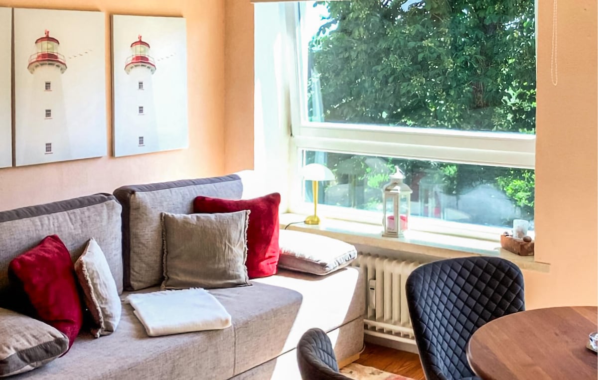 Tenemos un apartamento de 3 habitaciones de 65 metros cuadrados, en la planta baja, y situado en el centro de Husum. Enfrente está el parque del castillo con con el castillo de Husum, famoso por la floración anual de los azafranes. En el parque del castillo se puede correr, dar de comer a los patos o tomar un café en el castillo. En el parque también hay aparatos de gimnasia al aire libre que todo el mundo puede utilizar de forma gratuita. En la casa de la torre hay en la planta superior otro apartamento de vacaciones. La ciudad y el puerto se encuentran a 8 minutos a pie. El aparcamiento está delante de la casa.
