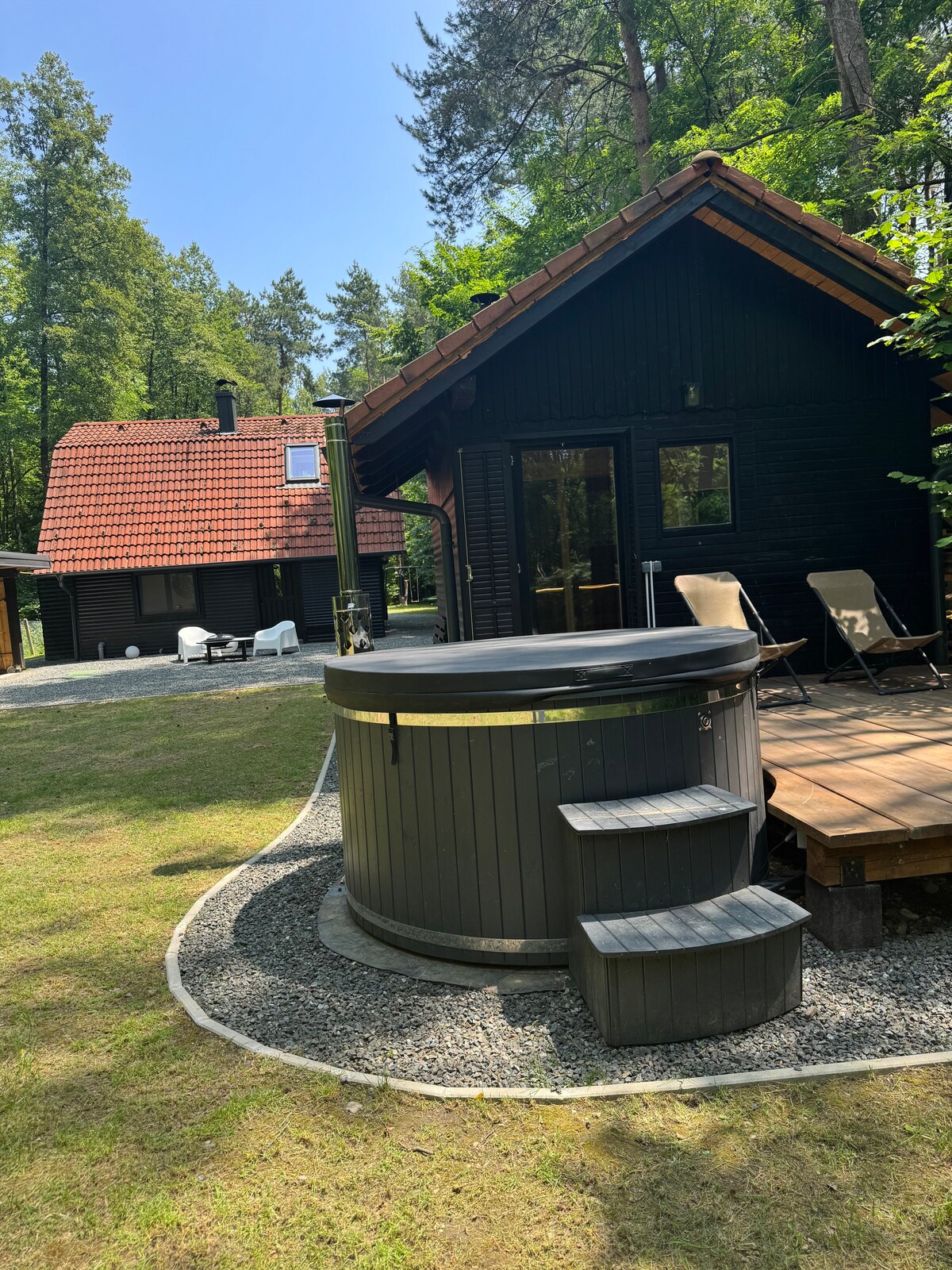Ubicada en lo profundo del bosque, nuestra cabaña ofrece total privacidad y paz. Tiene dos dormitorios, dos baños y un área de bienestar con bañera de hidromasaje, sauna y ducha fría. En el exterior, disfruta de una fogata y un parque infantil privado con tirolina, trampolín, columpios, saco de boxeo y kart todoterreno: diversión para niños y adultos. Una escapada perfecta para relajarte, recargar energías y reconectarte con la naturaleza.