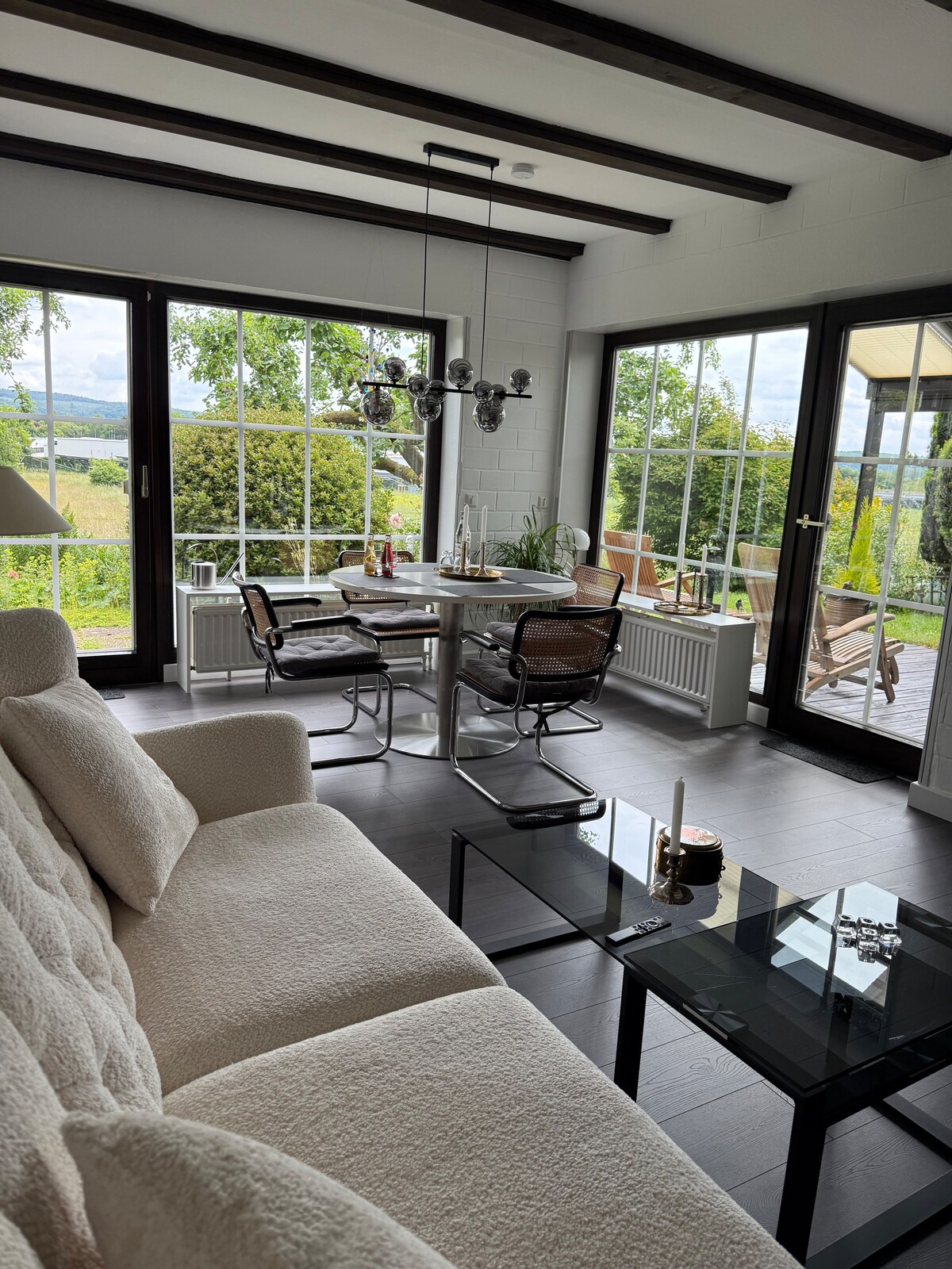Wir bieten ihnen unser in 2025 renoviertes Nichtraucher Haus mit 2 Schlafzimmern mit Kingsize Betten, einer hochwertigen voll ausgestatteten Küche, einem Wohn-/Esszimmer mit Kamin & TV, einem Gäste-WC und einem Badezimmer mit geräumiger Dusche an. Die Waschmaschine kann bei Bedarf genutzt werden. Vom offenen Wintergarten aus haben sie Zutritt zum wunderschönen Garten der zum ausruhen, geniessen und bei Lust zu einer Grillparty einlädt. Wir haben Fahrräder die sie kostenlos ausleihen können.