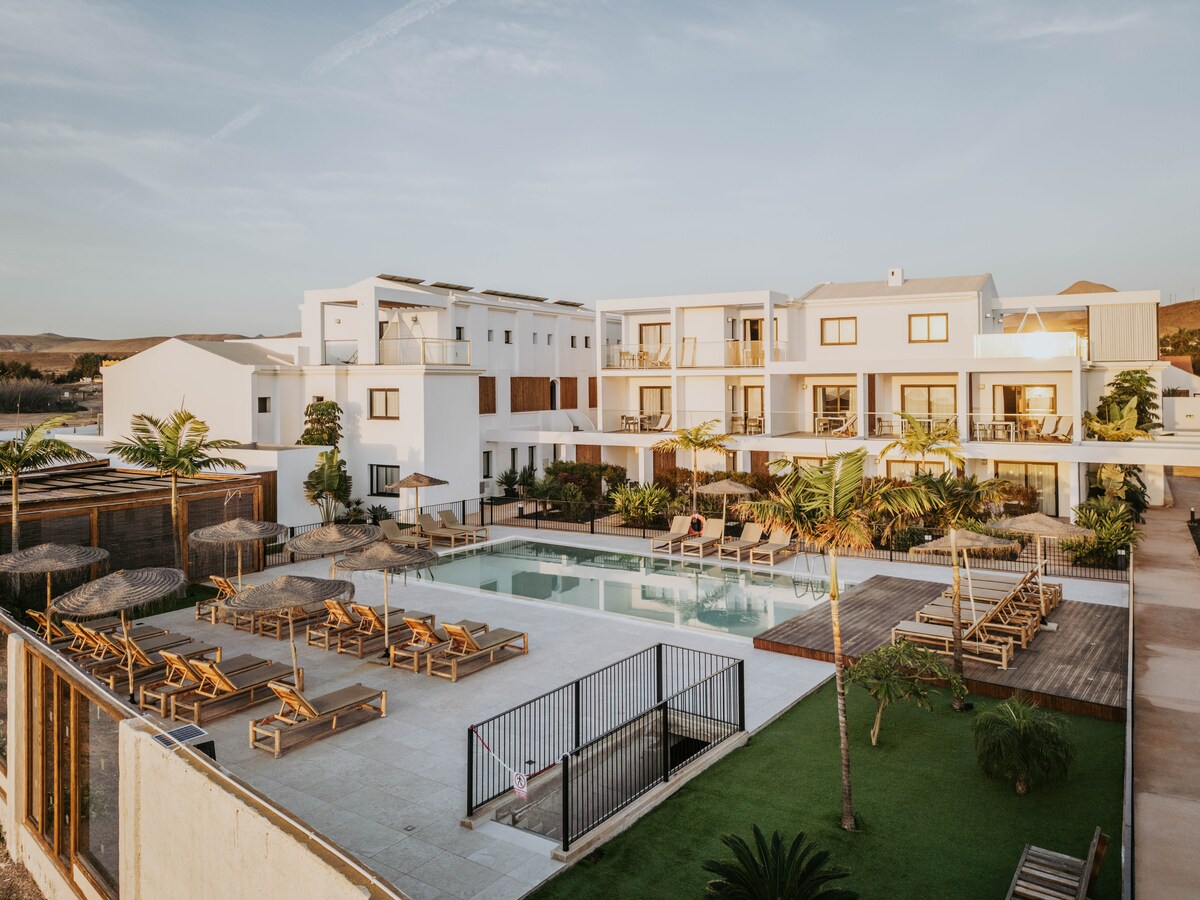 Descubre el apartamento "Oasis" en Shambhala: un refugio íntimo y luminoso con terraza privada, acceso a piscina climatizada, gimnasio y sala de yoga. Incluye desayuno buffet diario en el pool bar. Ideal para desconectar, descansar y disfrutar de una estancia saludable y relajante en Fuerteventura.