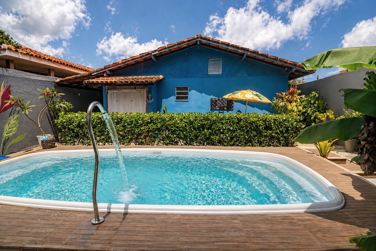 Casa en la arena en Barra do Jucu, Vila Velha-ES, con un estilo único, acogedor y sofisticado. Arquitectura de estilo cabaña, con jardín ornamental, zona de hamacas, ducha al aire libre y piscina con terraza y muebles para tomar el sol. Completa zona gourmet, ideal para preparar moqueca capixaba, con opción de barbacoa y fogón para los días fríos. Cerca de tiendas locales, playa Concha (mar tranquilo para niños) y a pocos minutos de Guarapari. Barra do Jucu es famosa por mantener su carnaval callejero tradicional (Congo).