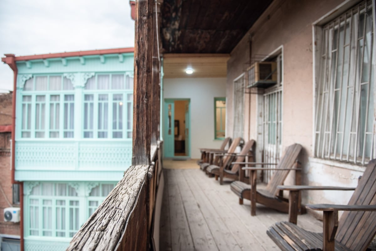Los apartamentos están ubicados en una antigua casa de dos pisos en el centro de Tiflis, donde encontrarás una feliz mezcla de historia, cultura y encanto georgiano. Aquí estarás encantado con la verdadera Tiflis con sus estrechas calles laterales y balcones de madera. Justo al lado de la casa, hay pequeños restaurantes con una amplia variedad de cocina georgiana, un centro comercial moderno y una bodega. La calle es tranquila y acogedora, mientras que a menos de 100 metros se encuentra la arteria principal de la capital: Rustaveli Avenue.