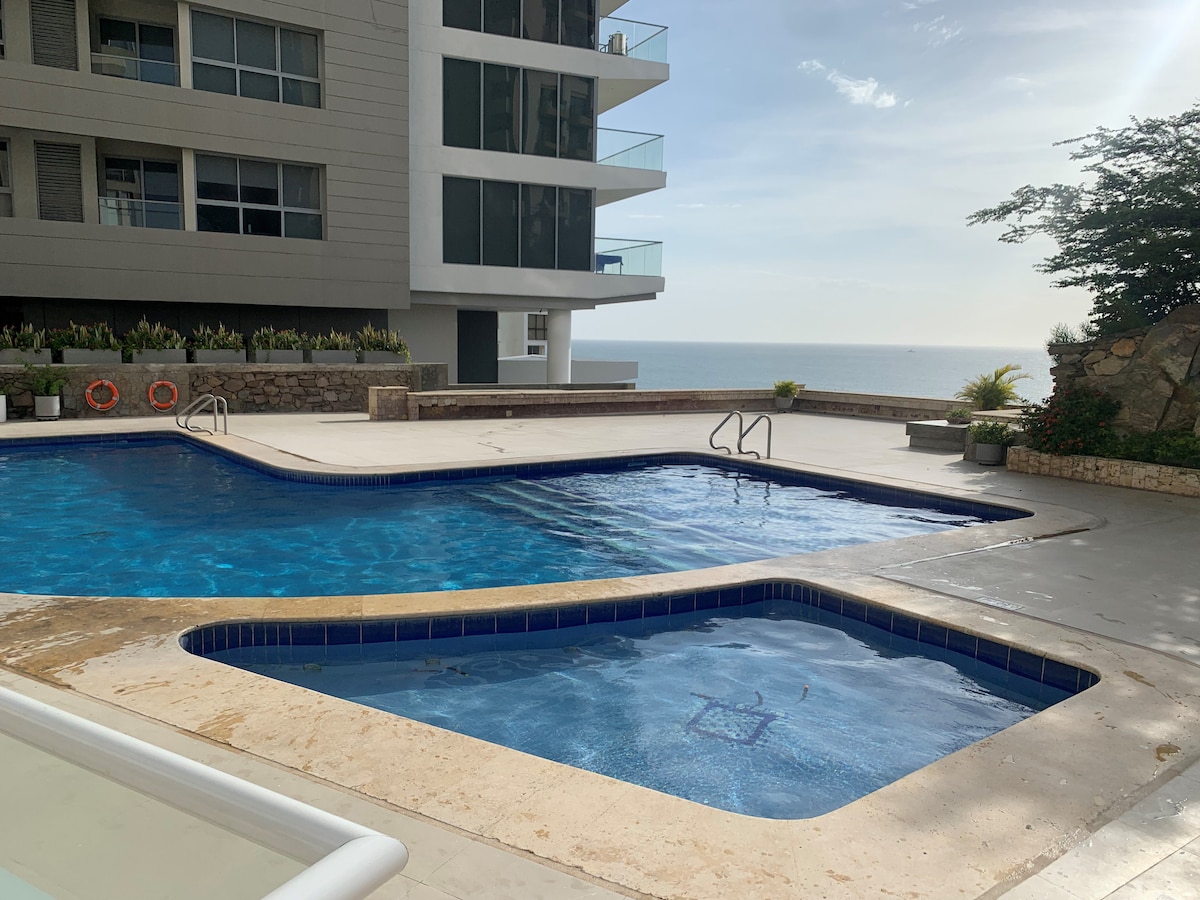Disfruta inolvidables momentos Santa Marta. Hermoso Apartamento, salida directa al mar, excelentes amenidades piscinas, jacuzzis, gym, senderos naturales, solárium y zonas infantiles. 2 habitaciones y un espacio privado con sofá cama o estudio, 2 baños con ducha, cocina dotada, calentador, lavadora y secadoras. Vista infinita al Mar y la Sierra desde nuestro balcón Piso 19 disfrutaras atardeceres mágicos, acceso directo a piscinas, jacuzzis, zona infantil. Accesible a movilidad reducida.