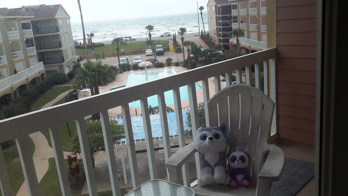 Este querido condominio estudio en esquina frente a la playa entre Stewart Beach y East Beach tiene un gran balcón y amplias vistas al golfo. Está bien equipado para dos o para un retiro en solitario. ¡El centro vacacional ofrece piscina y pickleball! No hay calle que cruzar para llegar a la playa, sin embargo, el condominio está cerca del centro de Galveston y del malecón. Disfruta de los hermosos amaneceres y contemplar la luna, sigue los cruceros de ida y vuelta, echa un vistazo a la actividad en la playa, flota en la piscina climatizada o relájate y observa las olas.