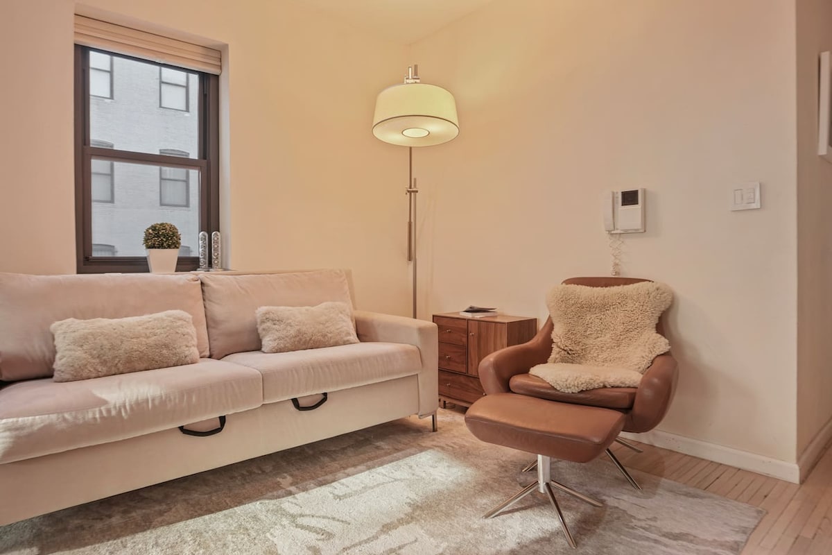 Bienvenido a tu escapada tranquila en el corazón de Midtown Manhattan. Este elegante apartamento de 1 dormitorio y 1 baño está escondido a solo unos pasos de la icónica Park Avenue y Grand Central Station, ofreciendo una comodidad inigualable sin el ruido. El espacio cuenta con una cama tamaño queen, un baño completo y una pequeña cocina totalmente equipada perfecta para cocinar o simplemente tomar un café por la mañana. La sala de estar es acogedora y está decorada con buen gusto, ideal para relajarse después de un día en la ciudad.