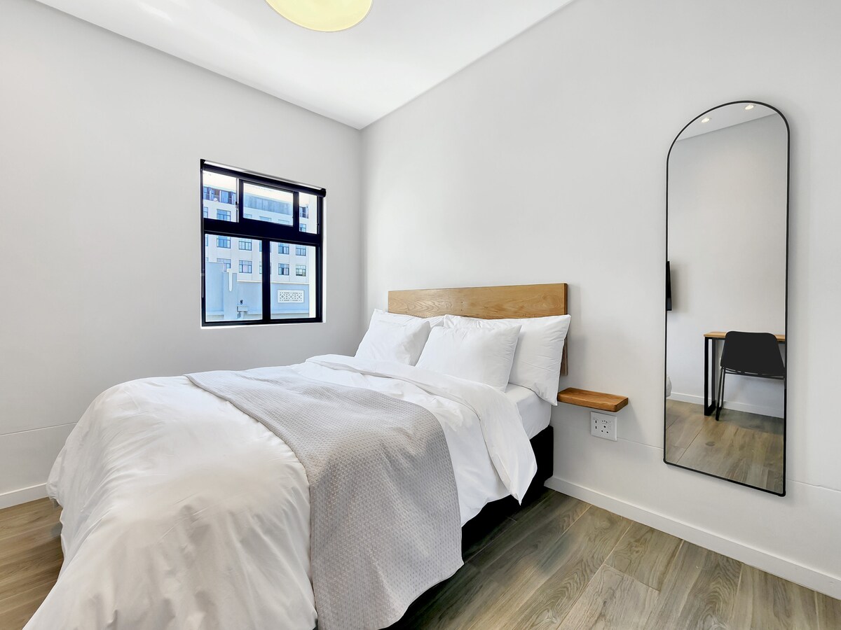 Nuestra luminosa y espaciosa habitación King ofrece espacio adicional, una cama tamaño king, baño privado, WiFi rápido, TV inteligente y un espacio de trabajo dedicado. Incluye servicio de limpieza diario con toallas y ropa de cama frescas, además de acceso a nuestra cocina compartida. Ideal para estancias más largas, parejas y viajeros de negocios que buscan comodidad, privacidad y seguridad en el lugar durante toda la noche. Ubicado en el corazón de Ciudad del Cabo, a pocos minutos de las playas de la ciudad y de las atracciones más queridas, como Table Mountain, V&A Waterfront y Long Street.