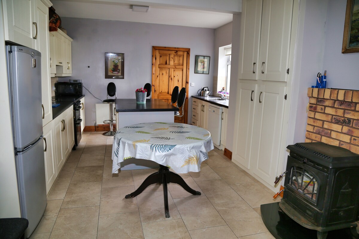 Dormitorios elegantes pero acogedores en nuestra casa de campo de época. En tu alojamiento se incluye un magnífico desayuno irlandés completo con panes horneados en casa. * opción vegana/ vegana disponible. Disfruta de una deliciosa cena casera por la noche, utilizando solo excelentes alimentos de origen local, con ensaladas de verduras y frutas de nuestro jardín. Nuestra acogedora cocina de campo es tu comedor privado, con hermosas sábanas y vajilla. Nuestras fotos te mostrarán algunos de nuestros platos. Consulta las reseñas.