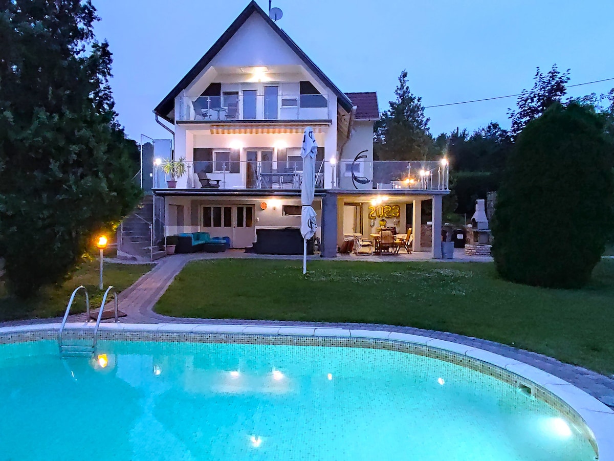 Damos la bienvenida a nuestros huéspedes a nuestra moderna casa de huéspedes con piscina, jacuzzi, panorámica y con aire acondicionado. Nuestros huéspedes pueden alojarse en una casa acogedora, cómoda y con aire acondicionado. La terraza ofrece una hermosa vista del lago Velence a poca distancia a pie, desde la que ocasionalmente podemos rastrear el despegue de globos aerostáticos. La piscina del jardín, la bañera de hidromasaje de 6 plazas y toda la propiedad son para el uso exclusivo de los huéspedes, el propietario no vive en la propiedad.