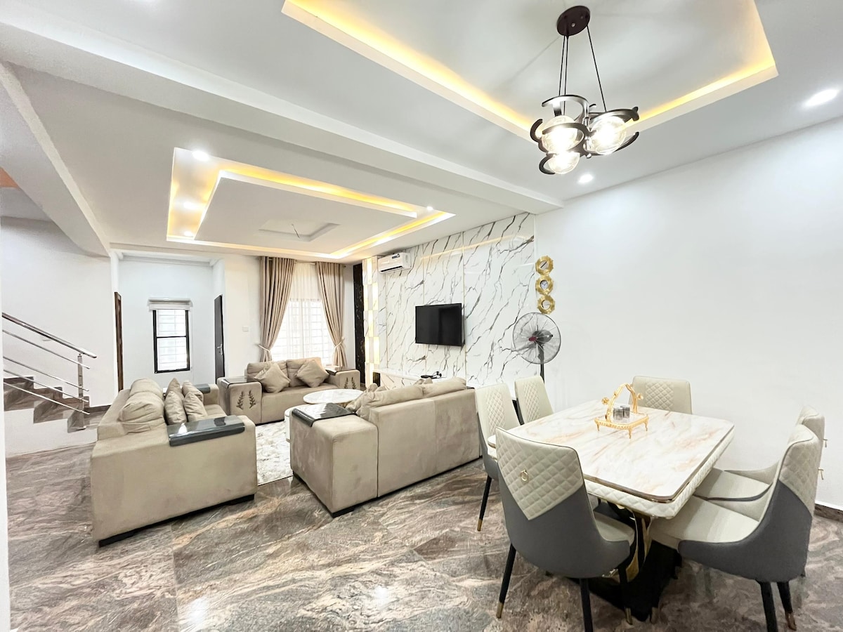 Una elegante casa de 4 dormitorios en el centro de Wuse 2, a pocos minutos de restaurantes, cafés y Transcorp Hilton. Ideal para familias y grupos. Disfruta de WiFi rápido, inversor solar confiable (energía 24/7), cocina totalmente equipada, estacionamiento seguro y ubicación segura. Los interiores modernos, las camas cómodas y el fácil acceso a las áreas clave hacen de esta una estancia perfecta y sin estrés. Ubicación ideal, perfectamente ubicada justo al lado de Ibrahim Babangida Way y Adetokunbo Ademola Crescent, cerca de restaurantes, cafeterías, centros comerciales.