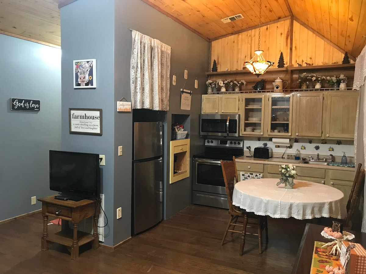 Tenemos un apartamento de huéspedes con temática de granja con su propia entrada privada y terraza privada con vistas a un lago privado a través de los árboles en los bosques de pinos del este de Texas. La habitación cuenta con electrodomésticos nuevos y una cafetera. Hay una cama tamaño king muy cómoda y un sofá cama. Hay mucho espacio en el armario. La cocina está totalmente equipada con platos y utensilios. También se puede acceder al cuarto de lavado. Este alojamiento está unido a mi casa, ¡pero somos vecinos tranquilos!