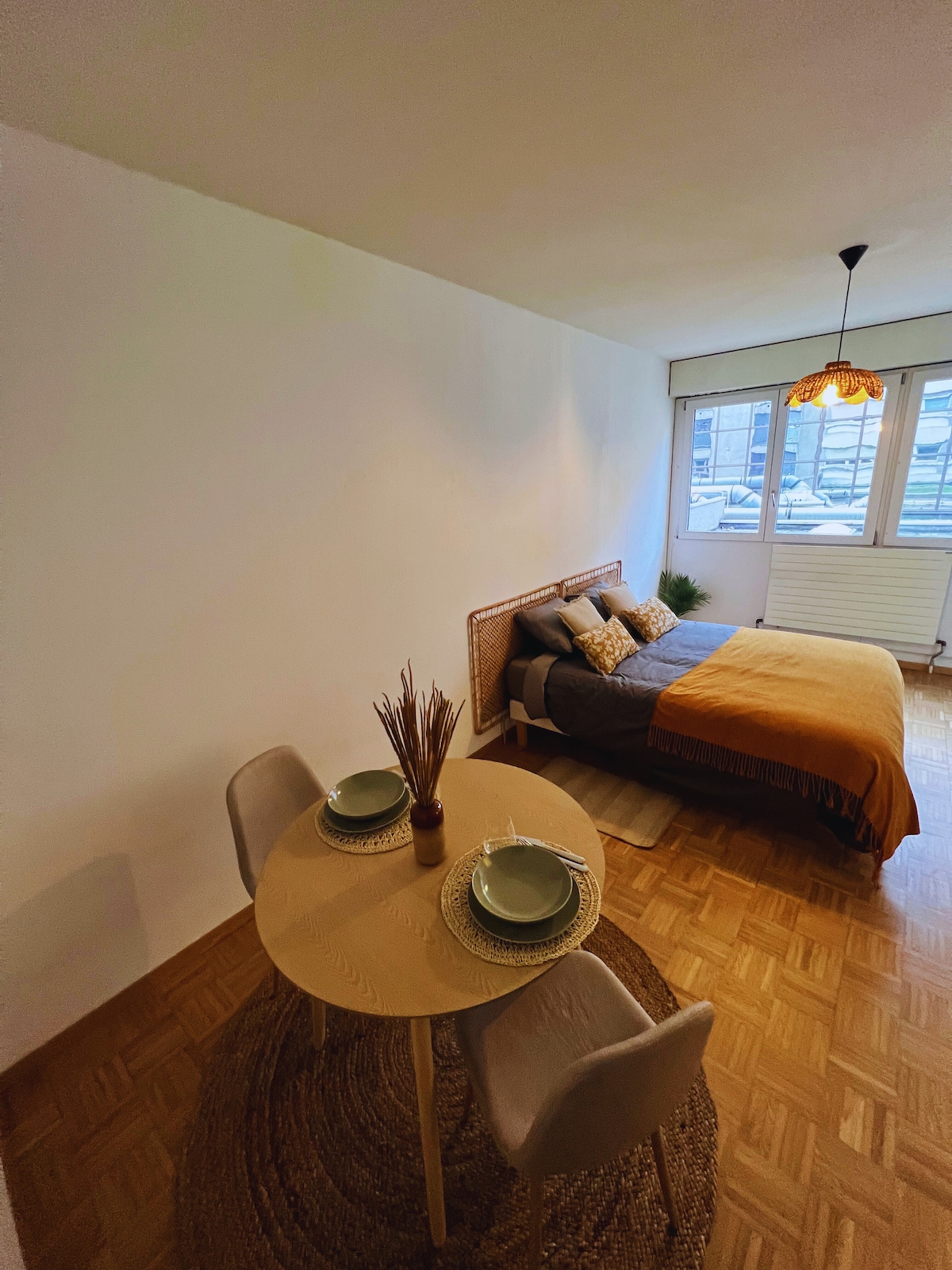 Apartamento nuevo recientemente publicado en Airbnb, actualmente en proceso de mejora pero ya listo para recibir huéspedes. Minimalista por diseño, ofrece lo esencial para una estadía cómoda para dos personas y coincide exactamente con las fotos. Dormitorio con cama y armario, sala de estar con sofá inflable, TV inteligente y wifi. Cocina equipada para dos, apartamento luminoso con balcón. La estación de tren de Ginebra está a 3 minutos a pie, y el centro de la ciudad y las boutiques de lujo están a unos 10 minutos a pie.