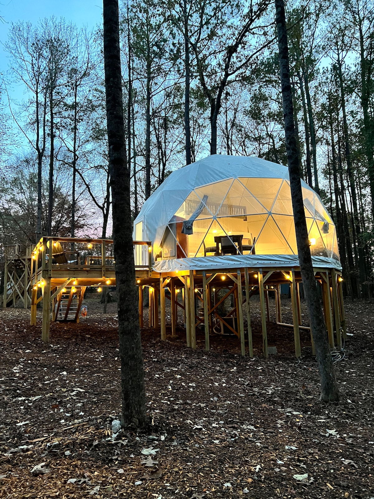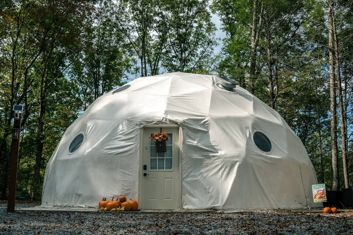 ¡Disfruta y relájate en nuestra cúpula glamping geodésica de diseño! Esta experiencia de glamping de lujo única te ayudará a relajarte, desconectarte y conectar con la naturaleza. ¡Experimenta el glamping fuera de la red con todas las comodidades de lujo! Diseño de estilo penthouse cargado por el diseñador, TV de 65 pulgadas con Netflix, Hulu, etc. ¡Colchón de memoria y lujosas sábanas de lujo en el dormitorio de abajo y loft queen arriba! ¡El tocador doble y la ducha de efecto lluvia con agua caliente proporcionan una experiencia de hotel de lujo de 5 estrellas mientras acampas!