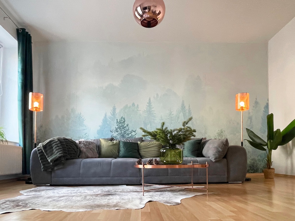 Aquí se puede vivir de forma extraordinaria, en este nuevo apartamento de lujo MAGIC FOREST, decorado por un diseñador de interiores, en estilo bosque. Un establecimiento que no deja ningún deseo por cumplir, para los huéspedes que aman lo especial. En el primer piso de un monumento cultural cuidado y restaurado, situado en una calle histórica del elegante distrito este, tiene todo: una ubicación céntrica en el mercado, una buena zona, aparcamiento en la puerta y un jardín con zona de estar.
