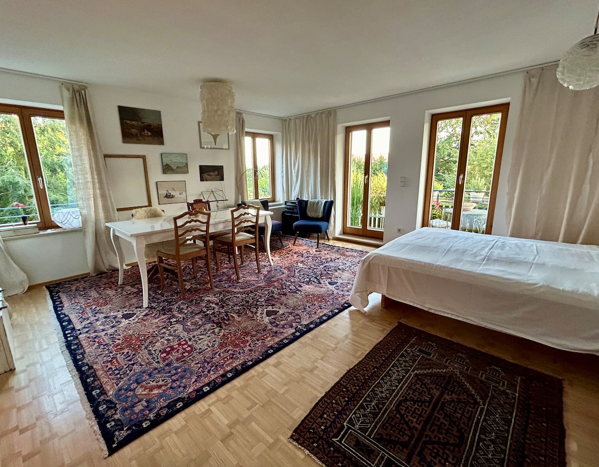 Pequeño estudio en el pueblo cerca de Isartal, balcón con vistas al jardín, Ideal para explorar lagos y montañas bávaras, hacer senderismo, andar en bicicleta, relajarse. Centro de la ciudad 600 m, posada/cervecería al aire libre, ALDI, EDEKA, heladería, etc. SE RECOMIENDA VEHÍCULO, estacionamiento gratuito, Cerca de la A8 y la A95, Centro de Múnich 35-60 min./U1 desde Mangfallplatz Park & R a la S7 a Höllriegelskreuth, el autobús MVV 271 va en 300 metros, pero NO HAY AUTOBÚS POR LA NOCHE; raro en el WE A 5 km de la línea 25 del TRANVÍA a Múnich, Wi-Fi NO SE PERMITEN RESERVACIONES PARA TERCEROS NI TRABAJADORES DE REUNIONES