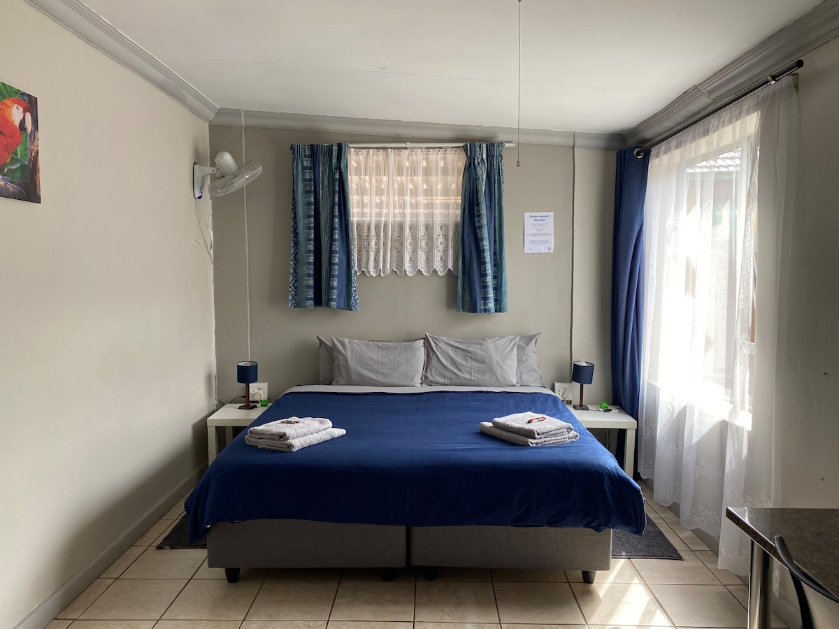 We are located 10km from O R Tambo International Airport. Quiet, safe and private home away from home.No need to meet us as the gate and room door is all done via a phone call to the gate and codes received once booking is confirmed. We are close to: 1. OR Tambo International Airport 9.9 km 2. Emperors Palace casino < Great entertainment> 7.9 km 3. East Rand Mall. (Shopping experience) 6.2 km 4. Wild Waters. (Great for a family outing) 7.9km 5. Birchwood Conference venue 8.1 km