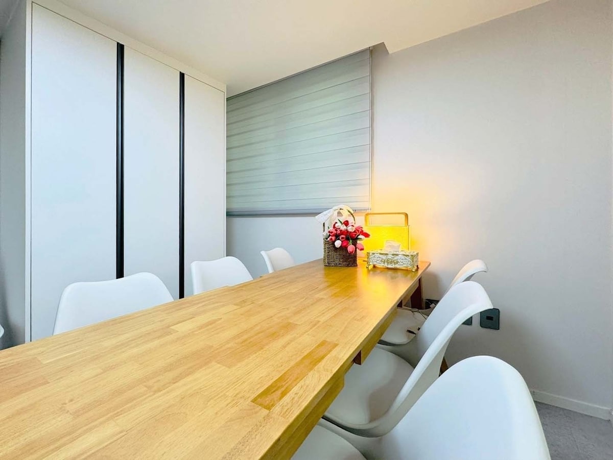 Este es StayDunsan, un alojamiento Gamseong en Dunsan-dong, Daejeon. - A 5 minutos a pie de la estación del Ayuntamiento/Oficina del Gobierno - Galería: a 4 minutos a pie. - A 3 minutos a pie del ayuntamiento de Daejeon. - A 4 minutos a pie del hospital local. - Puedes usar ropa de cama de hotel para dormir cómodamente. - La ropa de cama se cambia todos los días. - El baño está equipado con champú, acondicionador, gel de baño, toallas, cepillo de dientes, pasta de dientes, espuma limpiadora, secador de pelo de alta calidad y plancha rizadora. - La cocina tiene nevera, microondas, cafetera, agua, tabla de cortar, cubiertos, copas de vino, etc. - Sala de estar (TV/Netflix gratis disponible) - Este es un edificio nuevo con ascensor. - El estacionamiento solo está registrado para huéspedes de larga duración, y aparte de eso, debes estacionar en el estacionamiento público alrededor del edificio.(Estacionamiento público de lunes a viernes: 8:00 p. m. a 10:00 a. m. gratis/Fin de semana: gratis) [Precauciones] Llegada: 4:00 p. m. Salida: 11:00 a. m. (Si cambias la hora de llegada/salida, avísanos con anticipación) Está prohibido fumar en el alojamiento.