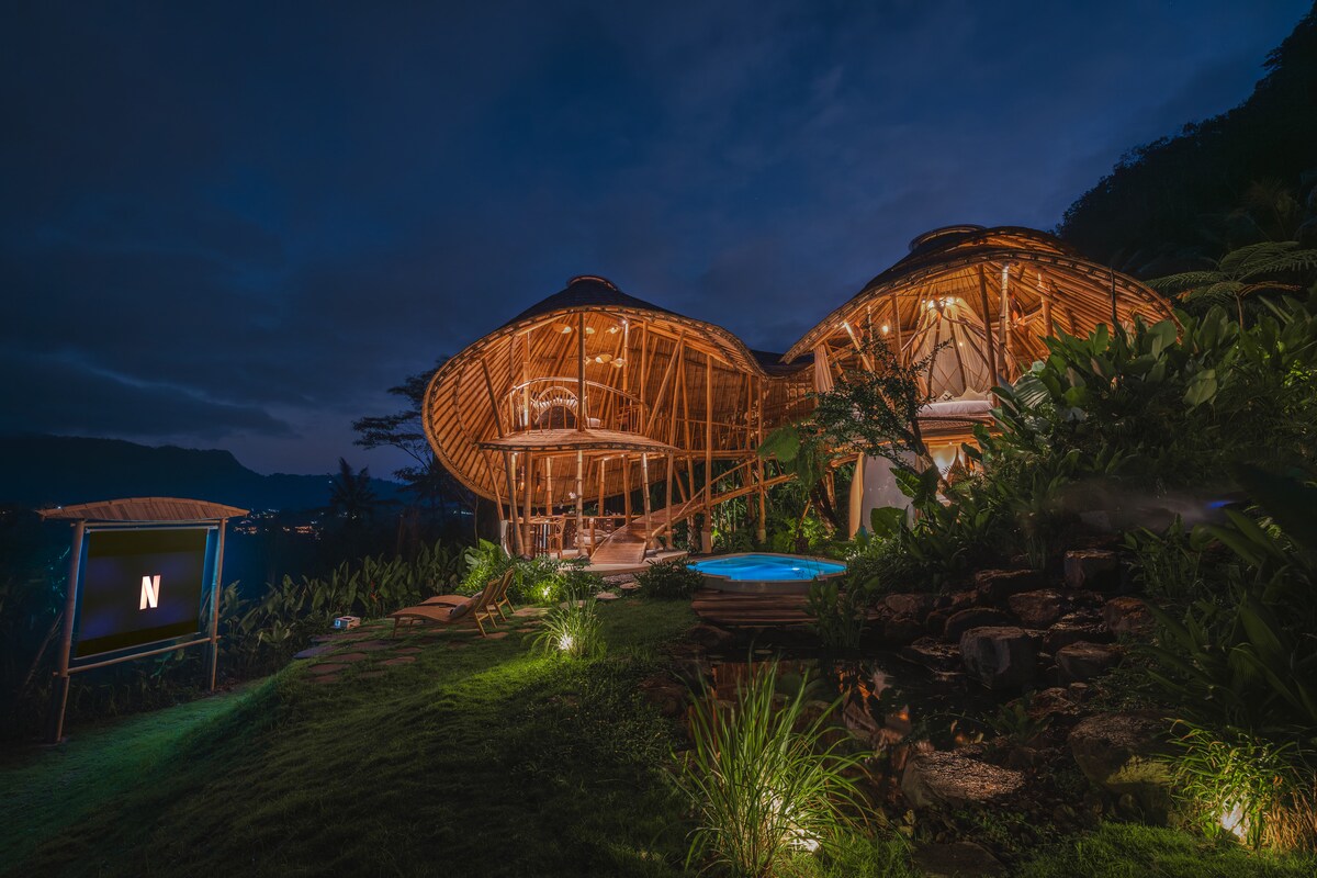 Disfruta de la máxima relajación en el corazón de Bali en una exclusiva villa de bambú de lujo en Sidemen. Despiértate con una vista impresionante del Monte Agung desde tu cama y relájate en tu piscina privada con jacuzzi rodeada de exuberante naturaleza. Disfruta de un desayuno de cortesía cada mañana y saborea deliciosas comidas en nuestro restaurante preparadas con productos frescos y orgánicos de nuestra propia granja. Un mayordomo dedicado está siempre a tu disposición para que disfrutes de una estancia perfecta y verdaderamente indulgente.