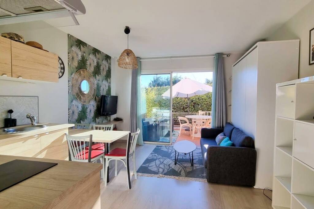 Una estancia en la playa, una gran terraza para comer tranquilamente o tomar el sol frente al mar con vistas a las islas, un jardín sombreado para echar la siesta, una ubicación ideal para unas vacaciones privilegiadas. el apartamento de 28 m2 tiene vistas al jardín , con cocina equipada, un dormitorio independiente con cuarto de baño integrado en la habitación ( ducha a ras de suelo y lavabo ) y aseo separado. Plaza de aparcamiento reservada cerrada por puerta automática.