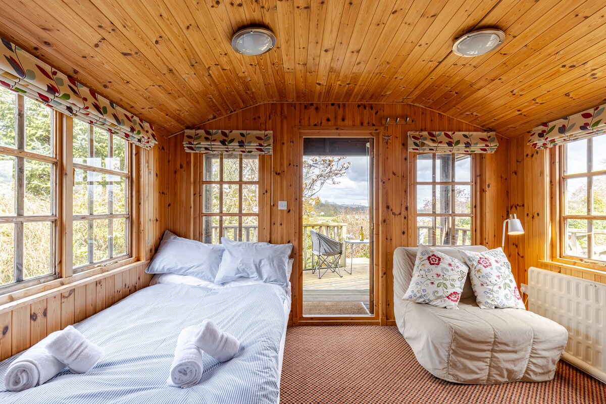 Cabaña independiente, autoservicio, en la cubierta junto a la residencia principal Ideal para parejas que salen. Maravillosa vista abierta con vistas al río Dee. MÁXIMO 2 adultos. 1 perro. Absolutamente NO FUMAR en la cabaña Una cama doble, con almacenamiento debajo, cama individual, TV, nevera, microondas, hervidor, freidora de aire, tostadora, platos, etc., inodoro y ducha. No hay placa de cocción ni horno. Toallas, ropa de cama, necesidades habituales proporcionadas Calefacción; radiadores llenos de aceite. Bonito paseo junto al río hacia la ciudad. Estacionamiento fuera de la carretera, espacio para bicicletas.
