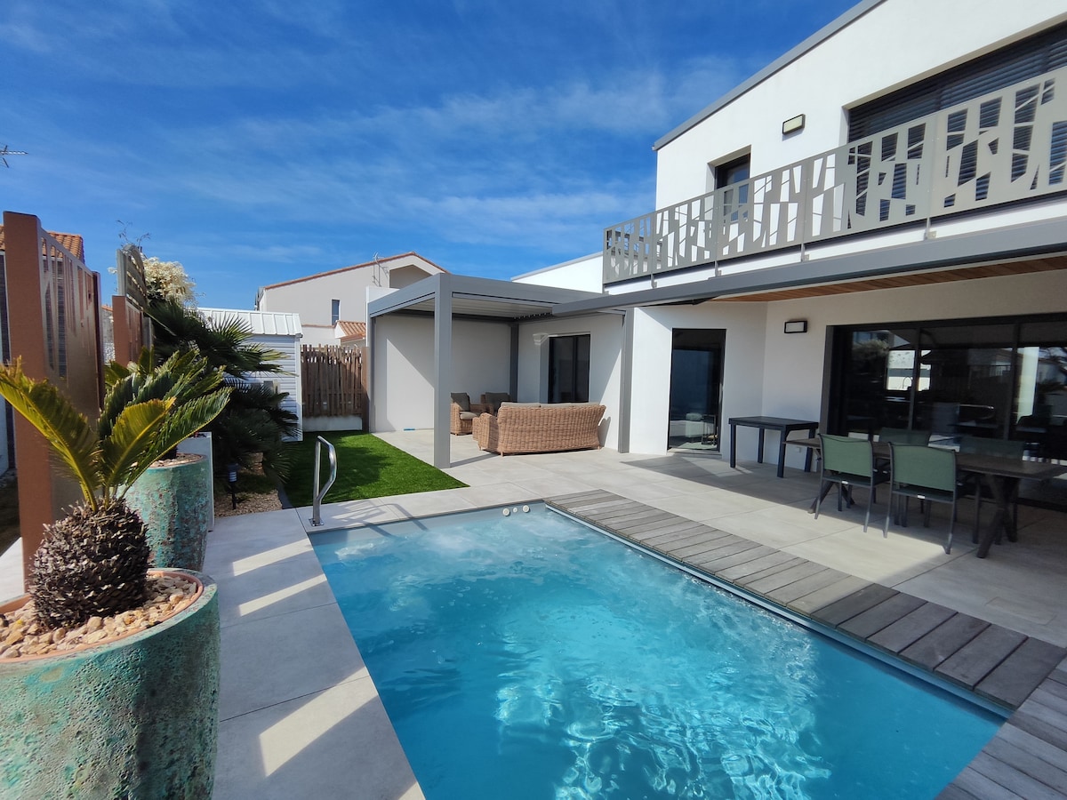 Casa nueva(2023) situada en el casco antiguo de Noirmoutier, zona muy tranquila a pocos pasos de los servicios (supermercado, bares, restaurantes, playas). Prestaciones de alta gama, piscina privada climatizada (hasta finales de septiembre) y persiana de protección. Totalmente cerrado, patio cerrado con puerta para 3 vehículos. Preau para las comidas que dan a la terraza de madera y a la piscina.