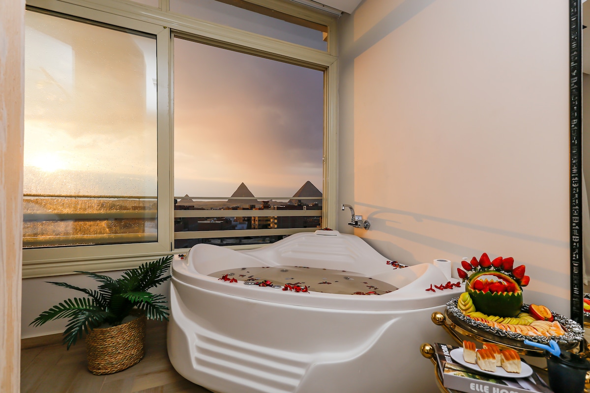 Habitación de hotel de lujo con vistas a las icónicas pirámides y jacuzzi