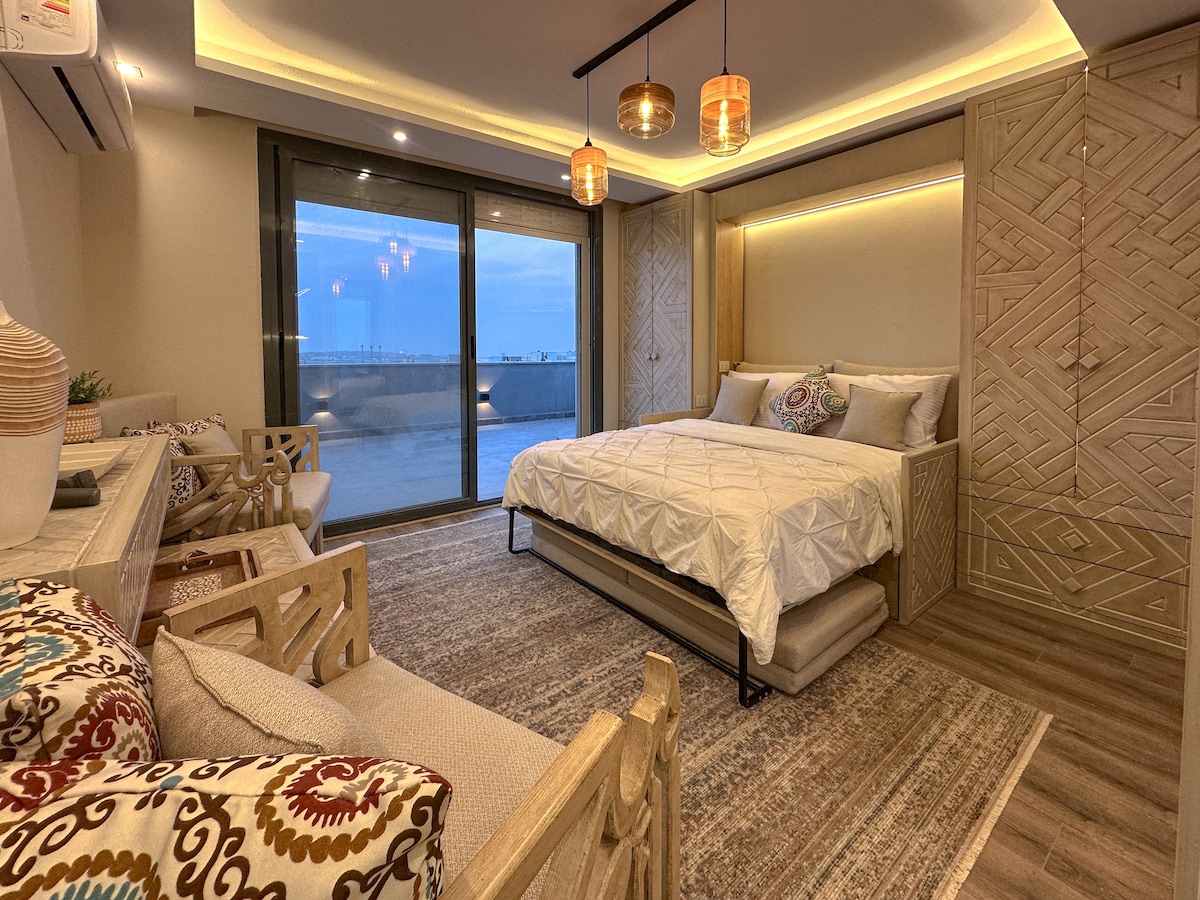 Gran estudio en el techo en un complejo de villas con un gran patio que tiene diferentes áreas de estar al aire libre con vistas a toda la ciudad desde arriba y el cielo comienza por la noche. El dormitorio cuenta con una cama multifuncional que se puede convertir en un sofá con bastante facilidad. Puedes encontrar un baño y cocina de muy buen tamaño en ese estudio. Vivirás en cada rincón una experiencia diferente en este espacio. También disfruta de diferentes comodidades como piscina, servicio de limpieza y conserjería.