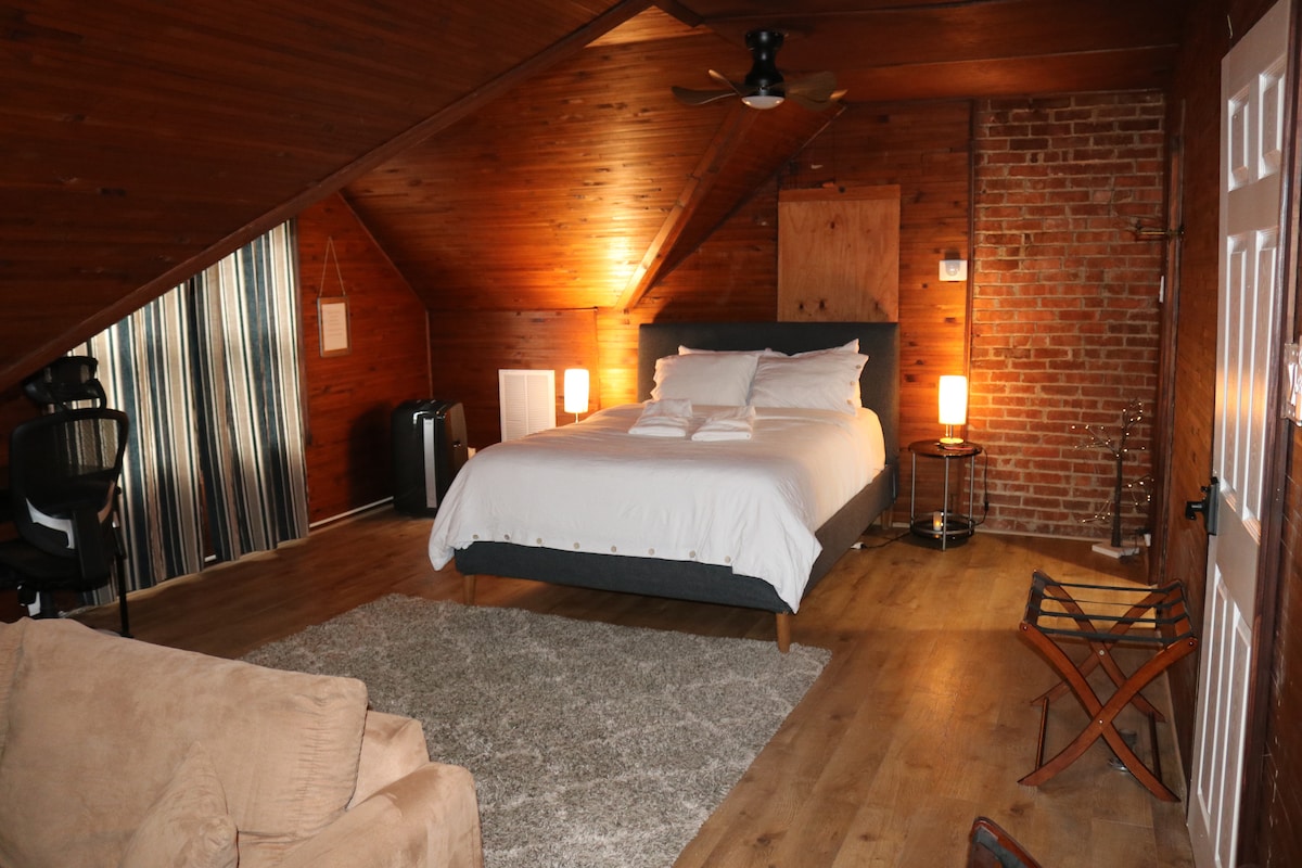 Must be at least 25 yrs old to book. *This is a quiet space as we live in the apartment below. Absolutely NO parties and a MAX of 2 people in the room at any time. This all wood, 3rd floor studio is right in the center of town. Tons of restaurants, bars, theaters, and super easy NYC transit (Train and Bus) are all just a few min walk away. The apt. is totally open, has a private entrance, private bathroom, amazing decor, parking and lovely touches throughout. ROMANTIC PACKAGES AVAILABLE.