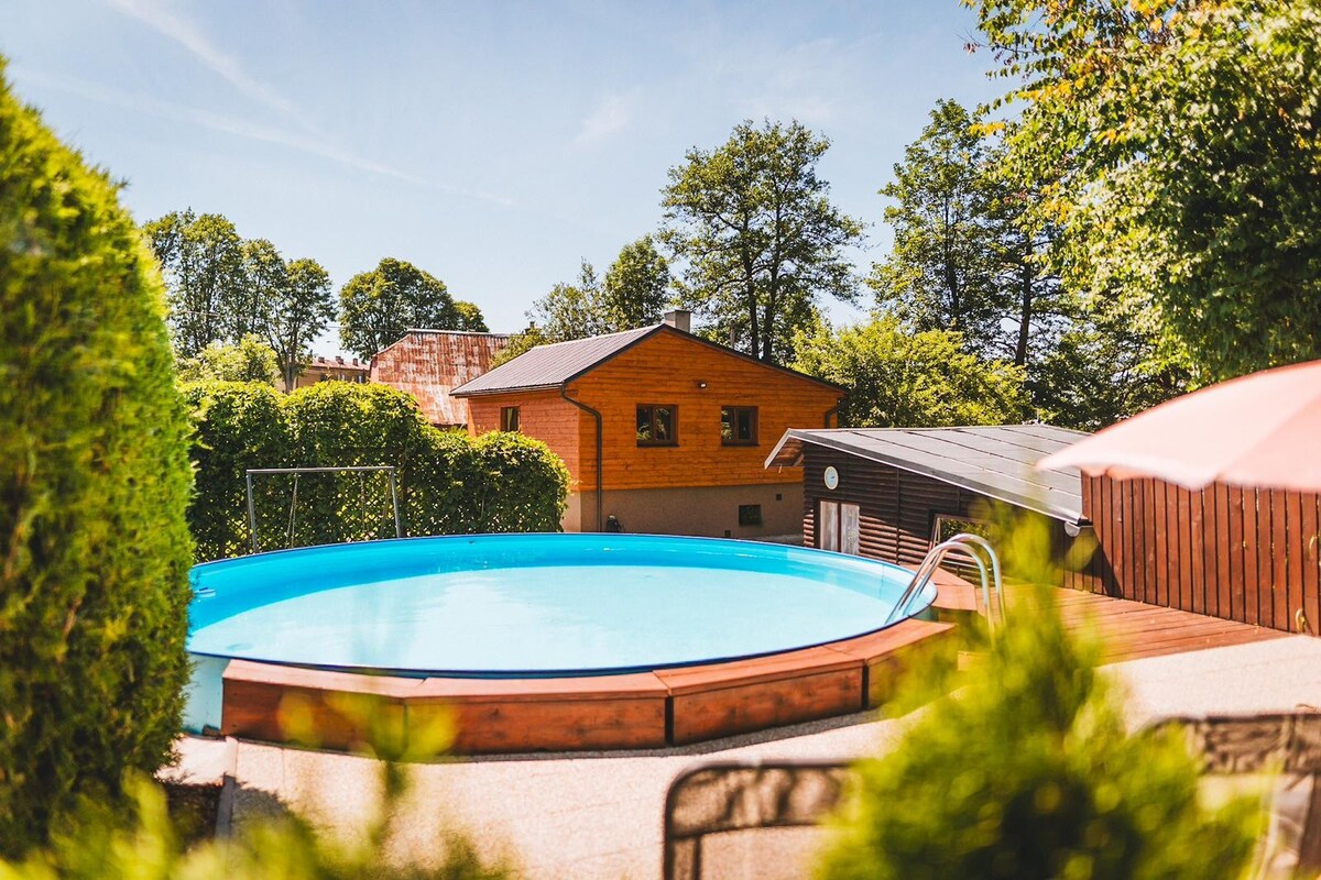 Le ofrecemos una casa totalmente equipada con seis camas, junto con terrenos adyacentes en la localidad de Pisary, en el municipio de Międzylesie, en el voivodato de Baja Silesia. En la planta baja de la casa hay una cocina, un baño y un salón con comedor. En la primera planta hay dos dormitorios. Cerca de la casa hay una zona de fogatas, un parque infantil y un jacuzzi sin cargo adicional. A unos 300 m de la propiedad hay un estanque donde se puede pescar. Le invitamos a reservar :)