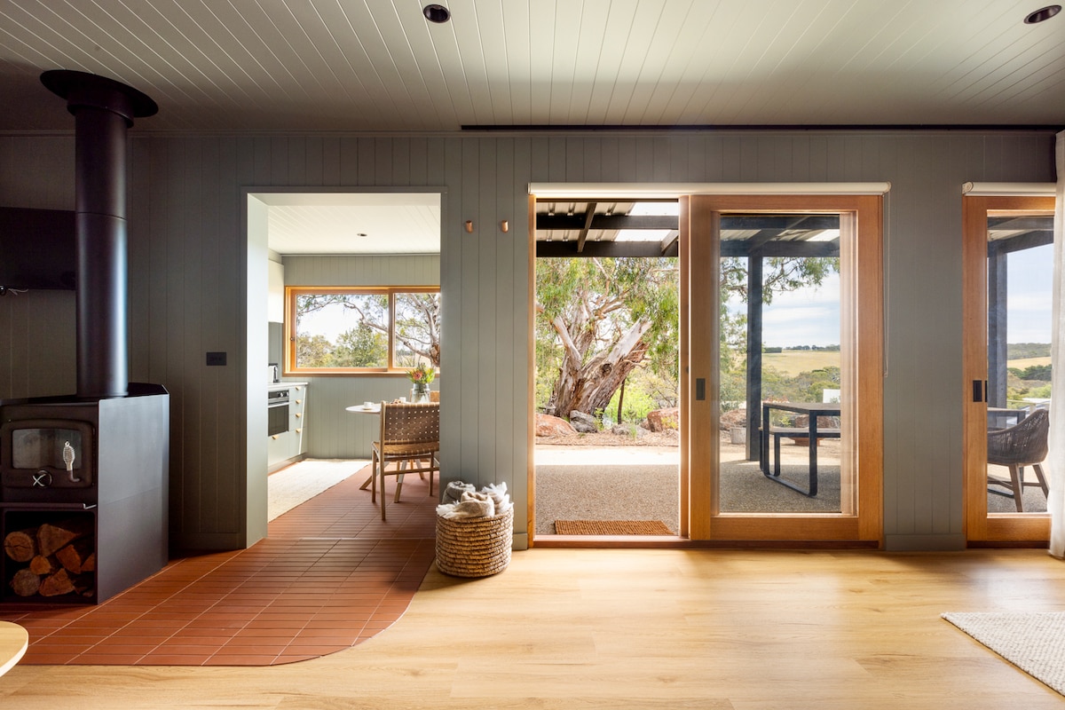 Perfect Escape only 1.15 hrs drive from Melbourne. Enjoy the open nature, let your eyes take in the amazing panoramic view. The place to Relax, Enjoy, Reconnect and Recharge your batteries in a beautiful natural light living room, sit around the Fire Pit on the outdoor furniture or on the veranda looking north over paddocks where the sky is your canvas. Close to the Great Ocean Road, 15 min to Geelong. One large bedroom and a very tiny bunk room. Private Sauna is often available on request.