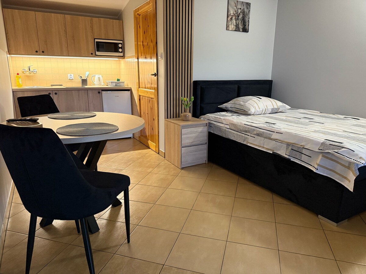 Studio apartment with terrace, equipped with: - Private bathroom - Fully equipped kitchenette - Smart TV In addition, our guests can enjoy: - Shared kitchen - Laundry room - Parking spaces - Free Wi-Fi throughout the property We offer a large garden with a fireplace and barbecue area, as well as a volleyball and soccer field. Excellent location: - 250m to the beach - 2km to the Powidz Military Base Discount for a long-term stay and cleaning service free of charge.
