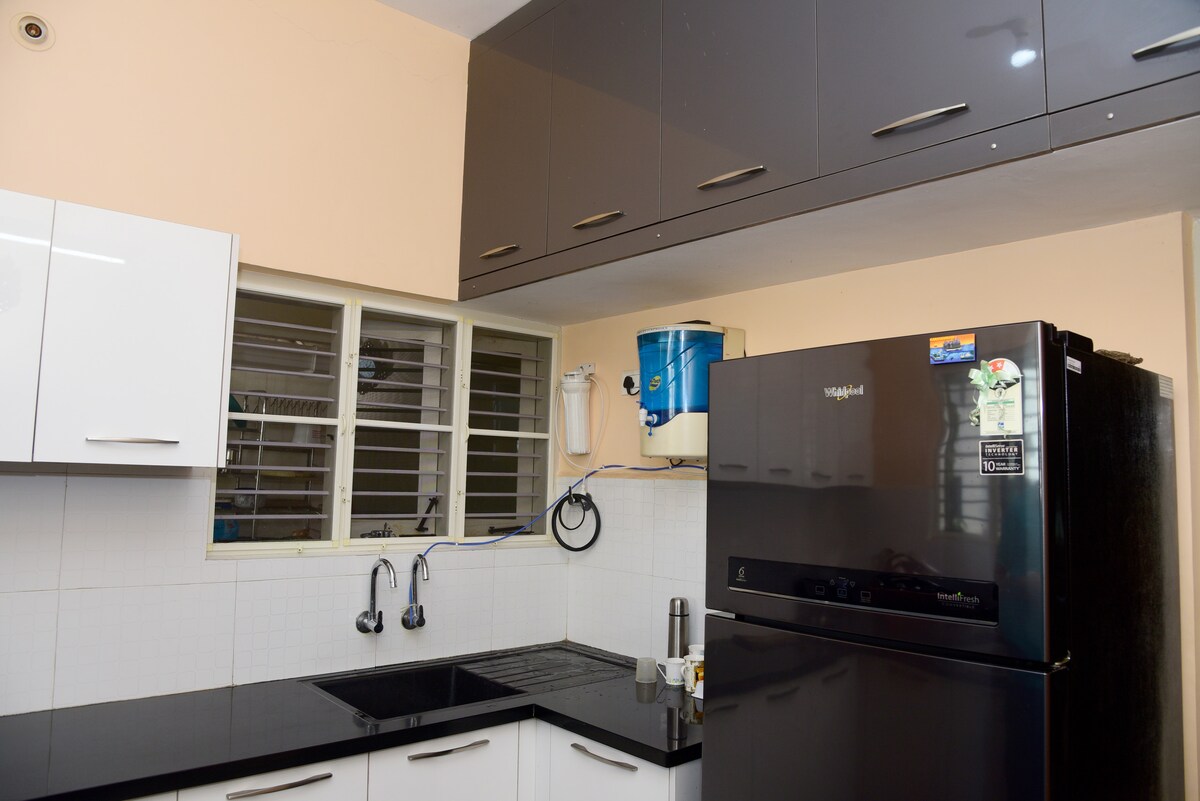 Casa independiente, 1ª planta, 2 dormitorios, baños adjuntos (un dormitorio con aire acondicionado, cargos adicionales por aire acondicionado según el uso real), ventilador de pedestal, agua caliente las 24 horas, TV de 48 pulgadas, UPS de energía de respaldo solo para iluminación y ventilador (unas 4 horas), wifi, terraza grande con vista al amanecer, balcón, sala de pooja, cocina abierta, nevera, GLP, batidora, utensilios, área de servicios públicos, lavadora automática, malla libre de insectos, armarios de acero, estantes de almacenamiento abiertos, estacionamiento, botiquín médico.