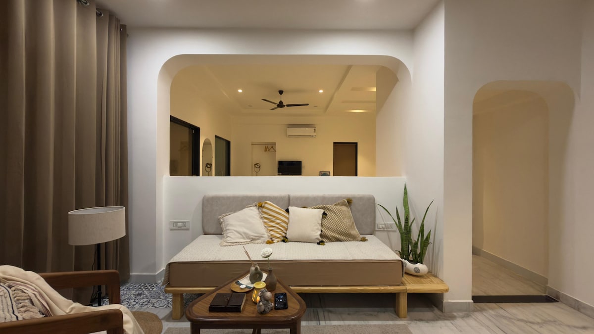 El Jharoka es un encantador 1 BHK de temática rosa a solo 500 metros del lago Fateh Sagar. Disfruta de un acogedor salón con Android TV y juegos, una cocina totalmente equipada y un tranquilo balcón rodeado de vegetación. Diseñado con elegantes toques de jharoka de Rajasthani, este alojamiento ofrece comodidad, privacidad y una estancia serena cerca de los lugares junto al lago de Udaipur. Ten en cuenta que el departamento está en el segundo piso sin ascensor, pero nuestro cuidador te ayudará con el equipaje.