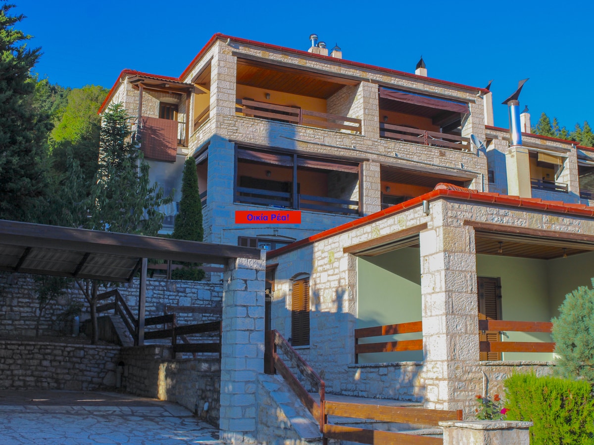 La casa está situada en el centro del hermoso pueblo nuevo de Mikro Chorio, muy cerca de la plaza del pueblo y del Country Club, en un entorno de ensueño a los pies de la montaña Chelidona con vistas a Kaliakouda y Velouchi. Construida con arquitectura tradicional de piedra y madera. Consta de dos viviendas independientes, una en la planta baja y otra en la primera planta. El apartamento de la primera planta tiene salón, cocina, dormitorio y baño.
