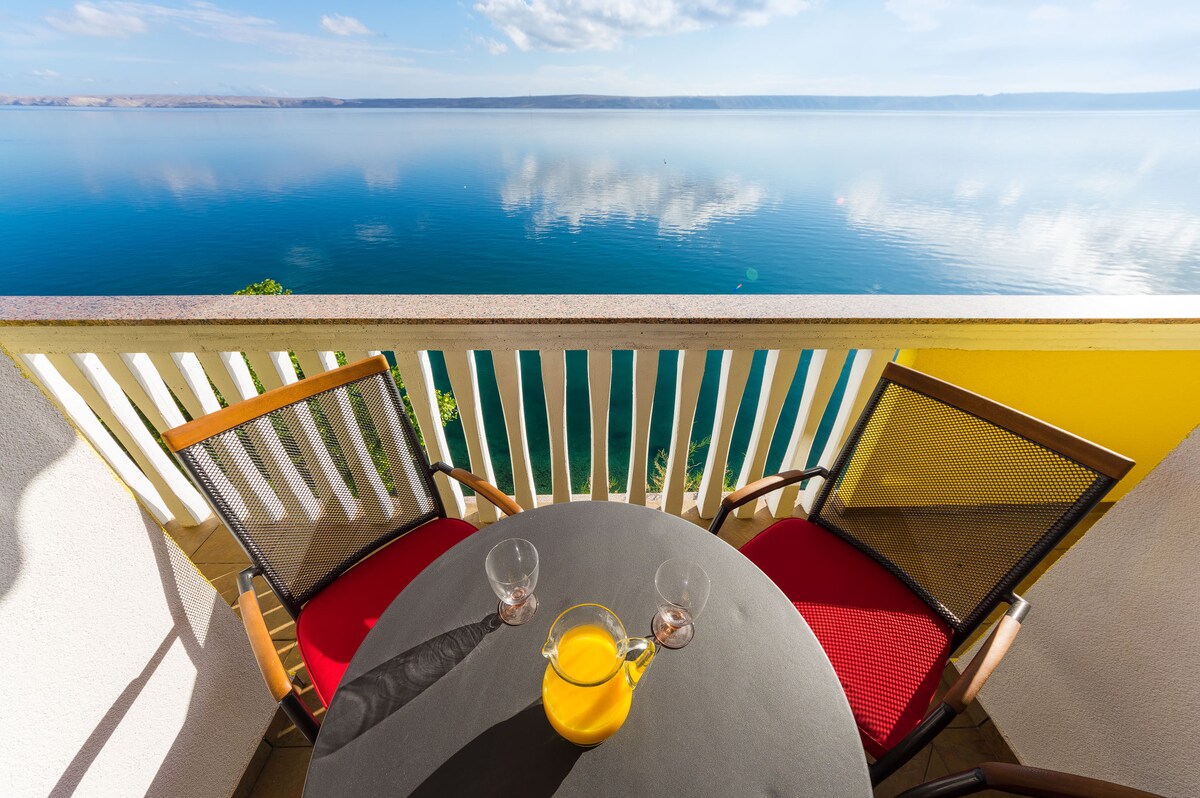 Departamento de 54 m² con dos dormitorios y un baño. En el primer piso con tres balcones frente a la bahía de Pag. El departamento se encuentra en un lugar muy tranquilo en primera línea del mar (a 50-60 m del mar) con vistas al mar. Delante de la casa hay un estacionamiento privado.